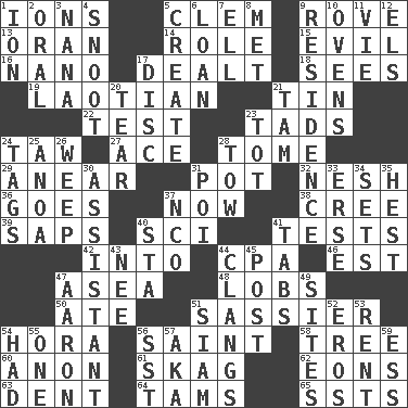 ACROSS 1. Charged atoms 5. Clement's nick name 9. Be footloose 13. Northwest Algerian city 14. Hero or heavy, e.g. 15. Tending to cause great harm 16. Billionth: prefix 17. Started a card game 18. Observes 19. Of or relating to Laos or its people 21. Metal container 22. Trial 23. Small boys 24. The 23rd letter of the Hebrew alphabet 27. Adept person 28. Heavy book 29. Approach 31. Cooking vessel 32. Delicate 36. Travels 37. At this time 38. Algonquian 39. Plant excrements 40. _-fi 41. Trials 42. To the inside or interior of 44. Numbers guy (abbr.) 46. Eastern Standard Time (abbr.) 47. At sea 48. Tennis shots 50. Had dinner 51. More lively and spirited 54. Israeli folk dance 56. Virtuous person 58. Relationship diagram 60. At once, immediately (arch.) 61. Heroin 62. Immeasurably long periods of time 63. Undesirable depression on a surface 64. Scottish caps 65. Fast planes DOWN 1. Electrically charged atom 2. Taken by mouth 3. Grandmother 4. Snout, nose 5. Cause to be 6. Grant temporary use of 7. Pipe bend 8. Was introduced to 9. Dwelling 10. Baking chambers 11. Compete 12. Raised railways 17. Compact _ 20. Pull into pieces 21. Scottish cap 23. Small child 24. Labels 25. Small Philippine buffalo 26. Shed a tear 28. Pull behind 30. Aide 31. Luau course 33. Celtic language 34. Puts into a specified state 35. Command 37. Non-commissioned officer (abbr.) 40. R.R. building 41. Bar bills 43. Born 44. Rings like a ship's bell 45. Mail 47. Composer Copland 49. Locates 51. Thailand, formerly 52. Greek god of love 53. Monthly bill 54. Possessed 55. Single 56. Fast jet (abbr.) 57. Alias (abbr.) 59. Curvy letter