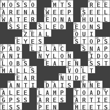 ACROSS 1. With motion or animation 6. Mountains (abbr.) 9. Portuguese money of account (variant) 12. Sports stadium 13. Shed a tear 14. Sew up the eyelids of hawks and falcons 15. Wetness 16. Pulitzer Prize-winning author Ferber 17. Frame or body of a ship 18. Compass dir. 19. Downhill vehicle 20. Immeasurably long periods of time 21. Ardor 23. Fr. "Yes" 24. Snake ____ (dice throw) 25. Halts 28. Writing tablet 30. Pale purple color 34. Fastener 35. Black tropical American cuckoo 36. High-strength synthetic material 38. Wedding promise 39. Tennis shots 41. Ingested 43. Fast jet (abbr.) 44. Promenades 46. Electrical Unit 48. Hearing organ 49. Unadorned 50. Against 51. Raised platform 53. Compass dir. 56. Toward shelter 57. Desk light 58. Sycophant 60. Global Positioning Systems (abbr.) 61. Ancient Greek god of war 62. Nick name for Arthur 63. Curvy letter 64. Writing instrument 65. Confronts DOWN 1. Informal term for the mouth 2. Mouths or openings 3. Arranges properly for use 4. Dwarf with a sinus problem 5. Rowing implement 6. Ancient Persian 7. Look after 8. Health resort 9. One who advocates reunion 10. Snakelike fish 11. Pipe bend 13. Water source 14. Yells 19. Indian antelope 20. Greek goddess of the dawn 22. Snakelike fish 24. The property of being fit to eat 26. Writing tablets 27. Specific locale 28. Inside of hand 29. Small Philippine buffalo 31. Potassium hydroxide 32. According to 33. Small bed 37. Mole, birthmark 40. Chalkboards 42. Lower and raise head in agreement 45. Indian title of respect (Mr.) 47. Poe poem 49. Pinches, bites 50. High mountains 51. Have the gumption 52. So be it 54. Nathan's nickname 55. Prepare for publication 56. Personal question 57. Infant locale 58. Scottish cap 59. It is so