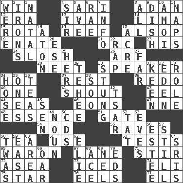 ACROSS 1. Victory 4. Indian skirt 8. First man 12. Epoch 13. "Terrible" tsar 14. Pale green bean 15. Round or rotation of duties 17. Coral ridge 18. Columnist Joseph or Stewart 19. Maternal 21. The grampus (Milton) 23. Part of HMS, perhaps 24. Splash clumsily 26. Sandy's bark 28. Confront 30. Orator 34. Being at a high temperature 37. Relief 39. Make new 40. Single 41. Yell 43. Snakelike fish 44. Oceans 46. Immeasurably long periods of time 47. Compass dir. 48. Gist 51. Yard entry 54. Allow head to fall sleepily 55. All-night dance parties 58. Beverage made from leaves 61. Purpose 63. Trials 65. Make _____ (do battle with) 67. Unable to walk 71. Agitate 72. At sea 73. On the rocks 74. Connecticut Ivy Leaguer 75. Play the lead 76. Snakelike fish 77. Raised railways DOWN 1. Past tense of be (plural) 2. Removes the wrinkles 3. Relating to or accompanying birth 4. Title for a knight 5. "___ Maria" 6. Actress Charlotte 7. A message received and understood 8. 100% 9. Food container 10. Mine, in Marseilles 11. Atlas contents 16. Tiny particle 18. 1/640 square mile 20. Compass dir. 22. Strike 25. Possessive pronoun 27. At a great distance 29. Giggle 30. Feeling sharp psychological pain 31. Peachy ____! 32. Genesis locale 33. Hero or heavy, e.g. 34. Flexible conduit 35. Singles 36. Beverages made from leaves 38. "Barney Miller" actor Jack 42. Russian ruler of old 45. Elected rep. 49. Part of speech 50. Music discs 52. Make lace 53. Nights before holidays 56. First name in cosmetics 57. Free from disturbance or agitation 58. It was, poetically 59. 90 degrees 60. Length times width 62. Writer Wiesel 64. Indian titles of respect 66. Boat paddle 68. Adept person 69. Cartoonist voice _ Blanc 70. Begley and Asner