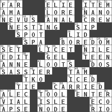 ACROSS 1. At a great distance 4. Writer Wiesel 8. A whole individual unit 12. Nursemaid (var.) 13. Old wives' tales, e.g. 14. Billionth: prefix 15. Congenital growth or mark on the skin 18. Of or related to the anus 19. Group working together 20. Nestling 22. Small drink 23. Specific locale 24. Flaplike covering 25. Health resort 26. Mood resulting from idleness 30. Put into a specified state 33. It is permitted: Lat. 36. "Death on the ____" 37. Prepare for publication 39. Set 40. Adolescent 41. Singer Murray 42. Plunders 44. Two (Sp.) 45. More impudent 47. Scottish cap 50. Ring climax 51. On the rocks 53. Neckwear 54. Borne 57. Actor Baldwin 59. Implement 61. Keyboard key 63. Small bottle 64. Small island 65. Environmental prefix 66. Domed church section 67. Thickened enlargement 68. _ de Janeiro DOWN 1. Air blower 2. So be it 3. All-night dance parties 4. Enthusiasm 5. Protracted 6. Lyricist Gershwin 7. Snakelike fish 8. Happening 9. Canvas cover 10. Compass dir. 11. Cut the grass 16. United States Postal Service (abbr.) 17. Halt 21. Slanted text style (abbr.) 22. Title for a knight 24. Car dealer's back yard 26. Waist strap 27. Passed on 28. Butter sub 29. Not women's 30. Oceans 31. Pulitzer Prize-winning author Ferber 32. Metal containers 34. Russian composer Stravinsky 35. Corporate head (abbr.) 38. One of the two male reproductive glands 42. Lion 43. Disorderly outburst 46. Mamie's mate 48. 43,560 square feet 49. Chow _ 52. Prevent from occurring 53. Afternoon social gatherings 54. Chilled 55. Toward shelter 56. Tenth: prefix 57. Actress Gardner 58. Mouth edge 59. Metal container 60. Bear (Spanish) 62. Friend of Pooh