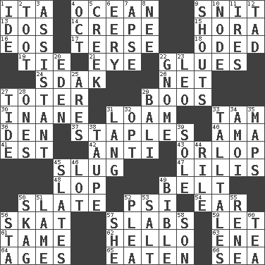 ACROSS 1. Call ___ day 4. Sea 9. In a ____ (agitated or irritated) 13. Two (Sp.) 14. Streamer paper 15. Israeli folk dance 16. Greek goddess of the dawn 17. Laconic 18. Wrote a lyric poem 19. Neckwear 21. Sight organ 22. Adhesives 24. Neighbor of Neb. 26. Remaining after all deductions 27. Carrier 29. Scornful sounds 30. Lacking in sense or substance 31. Rich soil 33. Scottish cap 36. Lair 37. Paper fasteners 40. Nursemaid (var.) 41. Eastern Standard Time (abbr.) 42. Against 43. Lowest deck of a ship 45. Strike heavily 47. Ms. Damita and namesakes 48. Chop off 49. Waist strap 50. Chalkboard 52. Air pressure measure (abbr.) 54. Hearing organ 56. Three-handed card game 57. Broad, flat, thick pieces 59. Allow 61. Docile 62. Phone greeting 63. Compass dir. 64. Eras 65. Eroded 66. Ocean DOWN 1. Binary compound 2. A blast of a horn 3. Helper 4. Sep. follower 5. Small stream 6. Suggestive of the supernatural 7. Domed church section 8. Born 9. Yells 10. Connecting point 11. Angers 12. Small amount or degree 20. Locale of original sin 22. Dwarf 23. Lion 25. Ancient Greek god of war 27. Event that recurs at intervals 28. Washington bills 29. Indonesian resort city 31. Austrian-born American filmmaker Fritz 32. Elect 33. Baron Munchausen's specialties 34. Mine, in Marseilles 35. Atlas contents 38. Grayish beige 39. Not divided or shared with others 44. Cause heat under the collar 45. Chalkboards 46. Car dealer's back yard 49. The Good Book 50. Heroin 51. Unable to walk 52. Entreaty 53. Table seasoning 55. French philosopher Descartes 56. R.R. building 57. A female animal or person 58. Male offspring 60. Beverage made from leaves