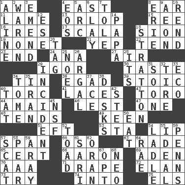ACROSS 1. Deep reverence 4. Compass direction 8. Ewer handle 11. Unable to walk 13. Lowest deck of a ship 15. To separate or throw off 16. Angers 17. Any of the three canals of the cochlea 18. The Jewish people; Israel 19. Music written for nine 21. Slangy assent 22. Watch over 23. Conclude 24. Santa ___, CA 27. Atmosphere 29. Russian composer Stravinsky 30. Clothes sense 34. Metal container 36. Mild oath 39. Unemotional 40. Torque (variant) 41. Shoestrings 43. "Corrida" creature 44. With great haste 46. For fear that 47. Single 48. Looks after 49. Peachy ____! 51. Newt 53. R.R. building 54. Mouth edge 57. Connect, as a bridge 60. Bear (Spanish) 63. Exchange 65. An absolute certainty 66. Composer Copland 69. Arabian gulf 70. American Automobile Association (abbr.) 71. Window treatment 72. Flair 73. Attempt to accomplish something 74. To the inside or interior of 75. Raised railways DOWN 1. Place in a line 2. Make _____ (do battle with) 3. Make improvements or corrections to 4. Greek goddess of the dawn 5. Curve 6. Kill 7. Lacquered or enameled metalware 8. One of the Great Lakes 9. Period of immesurable duration 10. Tear apart 12. Compass dir. 14. Dad 18. Ski resort town in Vermont 20. Label 25. Christmas carol 26. Therefore, facetiously 28. It is 29. Happening 31. Within a short period 32. Become fatigued 33. Environmental prefix 34. Heavy book 35. SW Asia republic 37. Adept person 38. Writing tables 40. Make lace 42. Proofreading order 45. Science/research agcy. 50. Consume 52. Frog relative 54. Dipping utensil 55. Standard of perfection 56. Actor Sean's family 57. Go away! 58. Lightbulb-shaped fruit 59. Like ___ of sunshine 61. Indian skirt 62. NW Algerian seaport 64. Actress Charlotte 67. Choose 68. Modern: prefix