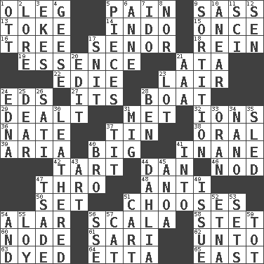 ACROSS 1. Cassini of fashion 5. Ache 9. Backtalk 13. Casino tip 14. Southeast Asian peninsula 15. At one time in the past 16. Relationship diagram 17. Sir (Sp.) 18. It's straight from the horse's mouth 19. Substance 21. "One Day ___ Time" 22. Singer Brickell 23. Den 24. Begley and Asner 27. ___ a Wonderful Life 28. Water vessel 29. Started a card game 31. Was introduced to 32. Charged particles 36. Nathan's nickname 37. Metal container 38. Taken by mouth 39. Operatic vocal solo 40. Large 41. Empty; void 42. Small pie 44. Daniel's nick name 46. Allow head to fall sleepily 47. Through, poetically 48. Opposed to 50. Arrange properly for use 51. Elects 54. Having or resembling wings 56. Any of the three canals of the cochlea 58. Proofreading order 60. Thickened enlargement 61. Indian skirt 62. To (old English) 63. Colored 64. Singer James 65. 90 degrees DOWN 1. Baseball player Mel 2. Old wives' tales, e.g. 3. Makes supply last 4. Honkers 5. Parts 6. Singer Murray 7. Wedding promise 8. Not either 9. Decision 10. Approach 11. _-fi 12. Elected rep. 17. In a ____ (agitated or irritated) 20. Prepare for publication 21. American Automobile Association (abbr.) 23. Car dealer's back yard 24. Pulitzer Prize-winning author Ferber 25. Letter starter 26. Suttee (variant) 28. Benjamin's nick name 30. Tough but pliablecoriaceous 31. Russian fighter aircraft 33. Northwest Algerian city 34. Billionth: prefix 35. Downhill vehicle 37. Teat (slang) 40. Sis' sibling 41. To the inside or interior of 43. Nonscientific branch of learning 44. Mexican or Central American flower 45. Small Philippine buffalo 47. Sadhe (variant) 49. Come out of 51. Haul 52. Inactive volcano in Sicily 53. Arranges properly for use 54. Plus 55. Myrna of the movies 56. Compass dir. 57. Domesticated feline 59. Small child