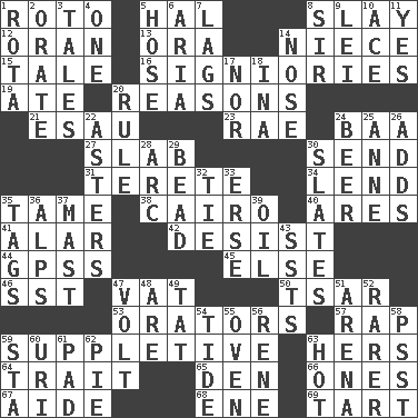 ACROSS 1. Printing process, for short 5. Actor Linden 8. Kill 12. Northwest Algerian city 13. Mouth or opening 14. Sibling's daughter 15. Falsehood 16. Seigniories (variant) 19. Had dinner 20. Thinks logically 21. He sold his birthright 23. Actress Charlotte 24. Sound made by sheep 27. Thick slice 30. Transmit 31. Cigar-shaped 34. Grant temporary use of 35. Not wild 38. Capital of Egypt 40. Ancient Greek god of war 41. Having or resembling wings 42. Stop 44. Global Positioning Systems (abbr.) 45. Otherwise 46. Fast jet (abbr.) 47. Large container 50. Russian ruler of old 53. Speakers 57. Reproach for some lapse or misdeed 59. Supplying deficiencies 63. Possessive pronoun 64. Distinguishing feature 65. Lair 66. Washington bills 67. Assistant 68. Compass dir. 69. Small pie DOWN 1. Roll call or roster of names 2. Declaim 3. Falsehoods 4. Single 5. Flexible conduit 6. Roberta Peters solo 7. Falls behind 8. Title for a knight 9. Flowery wreath 10. Adept person 11. Affirmative reply 14. Sense of smell 17. Not either 18. _ tizzy (2 wds.) 20. Governing power 22. Michaelmas daisies 24. Fermented drink made from hops 25. Singer Murray 26. Does sums 28. Curve 29. Necklace unit 30. Chalkboards 32. Neckwear 33. Celtic language 35. Labels 36. High mountains 37. Vertical spar for supporting sails 39. Petroleum 43. Fast planes 47. Electrical Unit 48. "We ___ not amused" (Victoria) 49. Make lace 51. Sports stadium 52. More valued for its uncommonness 54. Event that recurs at intervals 55. Baking chamber 56. French philosopher Descartes 58. Inconspicuous attention getter 59. R.R. building 60. RI univ. 61. Groovy apt. 62. Sliced dessert 63. Being at a high temperature