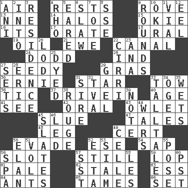 ACROSS 1. Atmosphere 4. Musical pauses 9. Be footloose 13. Compass dir. 14. Saint headwear 15. Migrant worker of the '30s 16. It is 17. Speak pompously 18. Mountain range 19. Petroleum 21. She-sheep 22. Lessep's creation 24. Texas town _ City 26. Working for oneself (abbr.) 27. Full of seeds 29. Pate de foie ____ 30. Bert's buddy 31. Play the lead 33. Pull behind 36. Nervous spasm 37. Popular '50s hangout 40. Mature 41. Observe 42. Relating to the mouth 43. A small or young owl 45. Turn sharply 47. Lies 48. Part of a journey 49. An absolute certainty 50. Elude 52. Compass dir. 54. Plant excrement 56. Narrow, elongated depression 57. Not moving 59. Chop off 61. Diluted with white 62. Having lost freshness 63. Curvy letter 64. Pismires 65. Makes less strong or intense 66. Arrange properly for use DOWN 1. Black tropical American cuckoo 2. To the inside or interior of 3. Dwelling 4. 17th letter of the Greek alphabet 5. Having ears or earlike features 6. Cole _ (cabbage dish) 7. Carry 8. Compass dir. 9. Periods in a boxing match 10. Gumbo ingredient 11. Small bottle 12. Snakelike fish 20. Farming town in central California 22. High-altitude cloud 23. Santa ___, CA 25. Colored 27. Puts into a specified state 28. 4th largest of the Great Lakes 29. Highlander 31. Title for a man of rank and authority 32. Federal power corp. 33. Baron Munchausen's specialties 34. Double curve, resembling the letter S 35. Moistens 38. Makeup applied to the cheeks 39. Musical sound 44. Armed conflicts 45. Chalkboards 46. Directed 49. Cell (Danish) 50. Flair 51. Electrical Unit 52. Singer James 53. Thailand, formerly 55. Airs 56. Health resort 57. Fast jet (abbr.) 58. French article 60. Pacific Standard Time (abbr.)
