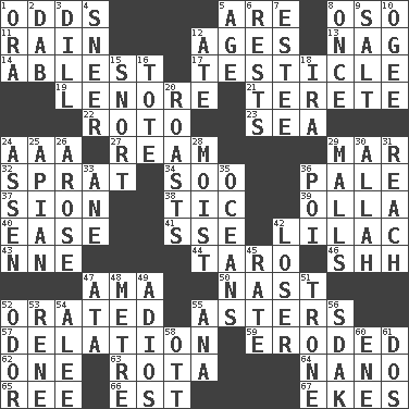 ACROSS 1. Likelihood 5. "We ___ not amused" (Victoria) 8. Bear (Spanish) 11. Water falling in drops from the sky 12. Ripens 13. Tired old horse 14. Most capable 17. A testis 19. Poe poem 21. Cylindrical with tapered ends 22. Printing process, for short 23. Ocean 24. Auto club (abbr.) 27. 480, 500 or 516 sheets of paper 29. Make imperfect 32. Small fatty European fish 34. "Barney Miller" actor Jack 36. Light colored 37. The Jewish people; Israel 38. Nervous spasm 39. Spanish pot 40. Comfort 41. Compass dir. 42. Pale purple color 43. Compass dir. 44. Pacific island yam 46. Quiet! 47. Nursemaid (var.) 50. Political cartoonist Thomas 52. Declaimed 55. Michaelmas daisies 57. Conveyance 59. Worn away 62. Single 63. Round or rotation of duties 64. Billionth: prefix 65. To riddle 66. Eastern Standard Time (abbr.) 67. Supplements with great effort DOWN 1. Mouth or opening 2. Apply (a substance) by light strokes 3. Deli pickle 4. Contemptuous expression 5. Personal question 6. Musical pauses 7. First name in cosmetics 8. At one time in the past 9. Table seasoning 10. Double curve, resembling the letter S 12. Had dinner 15. Derisive sound 16. Lug 18. Retirement account (abbr.) 20. Exposes to great heat 24. NE Netherlands city 25. Bee-related 26. Came up 28. Wet 29. Promenades 30. Assad's deity 31. Arrive at 33. One (Scot) 35. Seas 36. Luau course 42. Failure 45. Pace 47. "One Day ___ Time" 48. Distance measurement (Brit.) 49. Goodbye (Sp.) 51. Heavy duty weighing machine 52. Scent 53. French philosopher Descartes 54. Toward shelter 55. Santa ___, CA 56. Neighbor of Neb. 58. Baseball player Mel 60. Compass dir. 61. Two (Sp.)
