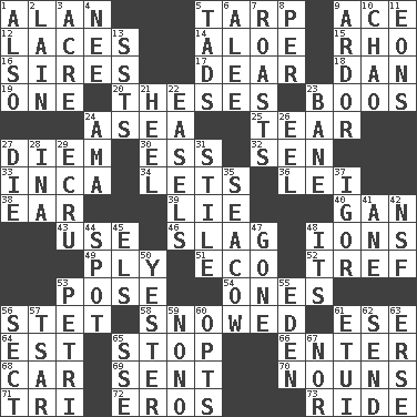 ACROSS 1. ____ Jay Lerner 5. Canvas cover 9. Adept person 12. Shoestrings 14. Medicinal plant 15. 17th letter of the Greek alphabet 16. Begets 17. Letter starter 18. One of the 12 tribes of Israel 19. Single 20. College papers 23. Expressions of contempt or scorn 24. Toward the sea 25. Pull into pieces 27. South Vietnam president (1954) 30. Curvy letter 32. Elected rep. 33. South American Indian 34. Allows 36. Flowery wreath 38. Ewer handle 39. Untruth 40. Separate the seeds from cotton 43. Purpose 46. Volcanic refuse 48. Charged particles 49. Apply oneself diligently 51. Environmental prefix 52. Unclean, religiously 53. Introduce or present, as a question 54. Washington bills 56. Proofreading order 58. Overwhelmed 61. Compass dir. 64. Eastern Standard Time (abbr.) 65. Obstruct or block passage 66. Keyboard key 68. 4-wheeled motor vehicle 69. Emitted 70. Parts of speech 71. Three (prefix) 72. Greek god of love 73. Travel on or in a vehicle DOWN 1. In addition 2. (Had) reclined 3. Measure of real estate 4. Born 5. Small amounts or degrees 6. Toward shelter 7. Cooks with dry heat, as in an oven 8. For each 9. Zeal 10. US Secretary of Labor Elaine L. _ 11. Immeasurably long periods of time 13. Fast planes 21. Person who is morally reprehensible 22. Artist's stands 23. Object of repulsion 24. Housemaid (var.) 26. Snakelike fish 27. Pass on 28. _ tizzy (2 wds.) 29. Shade of tan 31. Vertical member of a panel or frame 35. Manatee 37. Russian composer Stravinsky 41. A saturated hydrocarbon 42. Overdraft (abbr.) 44. Specific locale 45. Raised railways 47. Went 48. It is 50. Of or pertaining to yesterday 53. _ dish (used to culture cells) 55. Paradise 56. Religious group 57. Russian ruler of old 59. Words to Nanette 60. Elects 61. Needle holder 62. Transmit 63. Celtic language 65. Compass dir. 67. And not