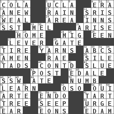 ACROSS 1. Root beer relative 5. Southern CA. univ. 9. Epoch 12. Afresh 13. Water falling in drops from the sky 14. Indian titles of respect 15. Welt 16. Type of rug 17. Restaurants 18. Fast jet (abbr.) 19. Cartoonist voice _ Blanc 21. Get up 22. Residence 24. Russian fighter aircraft 26. Car or cant ending 27. Crowbar 28. Yard entry 29. Become fatigued 30. Entertaining tales 32. Lettered men learn these first 36. So be it 37. Actress Charlotte 38. Filth; sediment 39. Small boys 40. Continued (abbr.) 42. Turn sharply 43. Mail 44. Peak District village in England 46. Compass dir. 49. Had dinner 50. Unfeeling 51. Acquire or gain knowledge or skills 53. Bear (Spanish) 54. Fr. "Yes" 57. Johnson of "Laugh-In" 58. Inside; within (prefix) 61. Small pie 62. Relationship diagram 63. Ooze 64. Goad 65. Ewer handle 66. Immeasurably long periods of time 67. Dutch treat DOWN 1. Crow sounds 2. Singles 3. Resembling or made to resemble leather 4. Leather borer 5. Mountain range 6. Auto 7. Whopper 8. Santa ___, CA 9. Bert's buddy 10. Remove soap 11. NE Netherlands city 14. Title for a knight 19. Madame (abbr.) 20. Suggestive of the supernatural 21. Ripen 23. Baking chambers 24. French painter Edouard 25. ___ a Wonderful Life 27. Pale green bean 28. Let have 29. Make lace 31. Came up 32. Indian state 33. Big road sign 34. A slight indication 35. Observe 40. Small bed 41. Hiding places for outlaws 43. Baking dish 45. Superhero pair 46. Chalkboard 47. Father Junipero _ 48. Wetness 52. To sift 53. I made a mistake 55. Capital and largest city of Mongolia 56. Detail 58. Compass dir. 59. Modern: prefix 60. Lair 61. Third day of the wk.