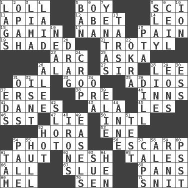 ACROSS 1. Hang loosely or laxly 5. Male child 8. _-fi 11. Capital of Western Samoa 12. Collude with 14. Lion 15. Homeless child 17. Grandmother 18. Ache 19. Cast a shadow over 21. Trinitrotoluene 23. Curve 25. "____ silly question..." 26. Having or resembling wings 27. Title for a knight 28. Area sheltered from the wind 31. Petroleum 33. Thick or sticky substance 35. Goodbye (Sp.) 37. Celtic language 38. Before (prefix) 40. Taverns 41. Natives or inhabitants of Denmark 43. Chicken ___ king 45. French article 46. Fast jet (abbr.) 47. Untruth 50. International (abbr.) 52. Israeli folk dance 53. Compass dir. 54. Pictures 56. Fortification 61. Strained 62. Soft 65. Stories 66. 100% 67. Turn sharply 68. Baking dishes 69. Cartoonist voice _ Blanc 70. Elected rep. 71. In a ____ (agitated or irritated) DOWN 1. Fails to keep up a pace 2. Brightly colored fish 3. Pale green bean 4. Put down 5. Prohibit 6. Chief or king in Benin or Nigeria 7. Gossips 8. Kill 9. To provide with a ceiling 10. Electrically charged atom 13. Tarsus (plural) 16. Be tempered by heat 18. Parent Teacher Association (abbr.) 20. To be drawn or hauled along 22. Gumbo ingredient 24. Riding implement 26. Toward shelter 28. Actor's bit 29. Immeasurably long periods of time 30. Double-curved letter 31. Mouths or openings 32. Is not 34. Mouth or opening 36. Deli pickle 37. Begley and Asner 39. Writer Wiesel 42. Groove 44. Singer Murray 48. Metal shackles 49. Artist's stands 51. Trial 52. Being at a high temperature 54. Light colored 55. Frame or body of a ship 57. Balmoral and tarboosh 58. ____ Jay Lerner 59. Painter Guido (1575-1642) 60. Inconspicuous attention getter 61. Scottish cap 63. Institute legal proceedings 64. Layer