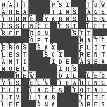 ACROSS 1. Electrical Unit 5. Air pressure measure (abbr.) 8. Pull behind 11. Length times width 12. Metal containers 14. Mature 15. Singer Mel 17. Tall tales 18. French article 19. Gist 21. Eastern Standard Time (abbr.) 22. Allow 23. To riddle 24. Spanish title 25. Be seated 27. Choose 28. Nathan's nickname 31. Greek god of love 35. Saxophone 37. Sudden quick movement 38. For fear that 39. _-fi 41. Monthly bill 42. Opposed to 43. Binary compound 45. Toward the sea 46. Christmas carol 47. Big collection agency 49. ___ Haven, CT 51. Lubricate 52. Lion 55. Affirmative reply 57. Raised railways 60. Separating forcefully 62. Connecticut Ivy Leaguer 63. Shoestrings 65. "_____ Recall" 66. 54 in ancient Rome 67. One who doesn't tell the truth 68. Wig 69. Area sheltered from the wind 70. Heredity factor (abbr.) 71. Ancient Greek god of war DOWN 1. Wetness 2. Came up 3. Laconic 4. Docile 5. Parent Teacher Assoc. 6. Male parent of an animal 7. Restaurants 8. Baron Munchausen's specialties 9. Double curve, resembling the letter S 10. 270 degrees 13. Fast planes 16. Inside; within (prefix) 17. Gossips 20. 911 reaches them 26. Kind of red light 29. Prong on a fork 30. Singer James 31. Enthusiasm 32. Western Nevada city 33. Clearly or manifestly demonstrative 34. Vertical member of a panel or frame 36. One more than ninety 40. Foolish or stupid persons 44. 4th largest of the Great Lakes 48. Narrow board 50. Not ill 52. 61 cubic inches 53. Related on the mother's side 54. Stares at amorously 55. Shout 56. Writer Wiesel 58. Put down 59. Examine minutely or intensely 61. Round or rotation of duties 64. Epoch