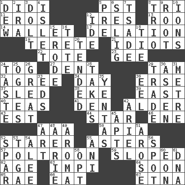 ACROSS 1. "You Light Up My Life" star Conn 5. Pacific Standard Time (abbr.) 8. Three (prefix) 11. Greek god of love 12. Angers 13. Friend of Pooh 14. Place for singles 17. Conveyance 19. Cylindrical with tapered ends 21. Foolish or stupid persons 22. Carry 23. Unit of force equal to gravity 24. Coat; cloak 27. Gouge 29. Scottish cap 32. Match 34. 24 hours 36. Celtic language 37. Downhill vehicle 38. Make supply last 39. Compass direction 40. Beverages made from leaves 41. Lair 42. Tree or shrub in the Birch family 43. Eastern Standard Time (abbr.) 44. Play the lead 46. Compass dir. 47. American Automobile Association (abbr.) 50. Capital of Western Samoa 52. A viewer who gazes fixedly 55. Michaelmas daisies 57. Characterized by complete cowardliness 59. Slanted 62. Grow older 63. Body of Kaffir warriors 64. Within a short period 65. Actress Charlotte 66. Ingest 67. Inactive volcano in Sicily DOWN 1. Morning condensation 2. Retirement account (abbr.) 3. Stupid person 4. Small island 5. Before (prefix) 6. Former Milwaukee Brewers owner Bud 7. Sadhe (variant) 8. Musical group of three 9. Carrot, for example 10. Charged particles 12. Binary compound 15. Wear away 16. Wig 18. Make a knot 20. Watched over 24. Clothes sense 25. Stares 26. Relatively large 28. Proceeds 29. Swap 30. NE Netherlands city 31. Distance measurement (Brit.) 33. Begley and Asner 35. Gossips 36. Snakelike fish 42. Satellite of Uranus 45. Flats, for short 47. Nonscientific branch of learning 48. Nest on high 49. Odor 51. Came up 52. Coast Guard woman 53. Ancient Roman robe 54. Toward shelter 55. Cuckoo 56. Specific locale 58. Choose 60. Period of immesurable duration 61. Heredity factor (abbr.)