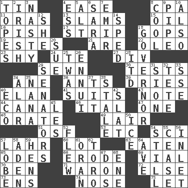 ACROSS 1. Shallow baking pan 4. Comfort 8. Tax preparer (abbr.) 11. Mouths or openings 13. Shuts with force 15. Petroleum 16. Expression of disdain 17. Empty completely 18. Republicans 19. _____ Park, CO 21. "We ___ not amused" (Victoria) 22. Margarine 23. Like a shrinking violet 24. Shoshoni 27. HTML Container Element 29. Stitched 30. Trials 34. One (Scot) 36. Pismires 39. Frees from moisture 40. Enthusiasm 41. Sets or collections 43. Make mention of 44. Lessep's creation 46. Slanted text style (abbr.) 47. Single 48. Speak pompously 49. Den 51. Order of Saint Francis (abbr.) 53. And so on (abbr.) 54. _-fi 57. Cowardly lion portrayer 60. Car dealer's back yard 63. Ingested 65. Lyric poems 66. Wear away 69. Small bottle 70. Benjamin's nick name 71. Make _____ (do battle with) 72. Otherwise 73. Followers of ems 74. Characteristic smell of wine 75. Allow DOWN 1. Drinks excessively 2. From or relating to Ireland 3. Offensive 4. Curvy letter 5. Keyboard modifier key 6. "Two Mules for Sister ____" 7. Arab leader 8. Calm and collected 9. Corncob 10. In addition 12. A female animal or person 14. Broke a traffic law 18. State head 20. Take to court 25. It was, poetically 26. World-weariness 28. It would 29. Elected representatives 31. The Jewish people; Israel 32. Wig 33. Compass dir. 34. Having or resembling wings 35. Grandmother 37. Teat (slang) 38. Lacking originality or spontaneity 40. Environmental prefix 42. Narrow board 45. French article 50. Frozen water 52. Soared 54. Free from disturbance or agitation 55. Desist 56. An arm off of a larger body of water 57. Ear part 58. An important port of Yemen 59. Coop moms 61. Northwest Algerian city 62. "Corrida" creature 64. "___ Maria" 67. Two (Sp.) 68. Compass dir.