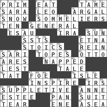 ACROSS 1. Demure 5. Consume 8. Docile 12. "Two Mules for Sister ____" 13. Lion 14. Therefore, facetiously 15. Frozen precipitation 16. Wine waiters 19. "___ Little Indians" 20. Commissioned military rank 21. Son of Isaac 23. Retirement account (abbr.) 24. Player for Phoenix 27. Fast planes 30. Inactive volcano in Sicily 31. Unemotional ones 34. It's straight from the horse's mouth 35. Indian skirt 38. Drinks excessively 40. Von Bismarck 41. Ancient Greek god of war 42. Slept 44. For fear that 45. Story 46. Make lace 47. Enemy 50. Small island 53. Heighten or intensify 57. Big collection agency 59. Supplementary 63. Singer Murray 64. First name in cosmetics 65. Baking dish 66. Costume for a special activity 67. Pull apart 68. Compass dir. 69. At sea DOWN 1. Inconspicuous attention getter 2. The wife of a rajah (variant) 3. Metal shackles 4. Opening into something insatiable 5. Otherwise 6. Period of immesurable duration 7. Heavy book 8. Three (prefix) 9. Ripen 10. Third mo. 11. Raised railways 14. Silent film actress Nazimova 17. Medical imaging device (abbr.) 18. Hearing organ 20. Abrupt rush of wind 22. Help 24. Proofreading order 25. A single undivided whole 26. Billionth: prefix 28. Small child 29. The Jewish people; Israel 30. Eats (away) 32. Numbers guy (abbr.) 33. Back-to-school mo. 35. Table seasoning 36. Length times width 37. Relief 39. Health resort 43. Writer Wiesel 47. Do some clerical work 48. Single 49. Eastern Standard Time (abbr.) 51. "_ and Lucy" (Charlie Brown theme song) 52. Bert's buddy 54. Corncob 55. _ the terrible 56. French philosopher Descartes 58. Stalk of a moss capsule 59. Arrange properly for use 60. Purpose 61. Parent Teacher Association (abbr.) 62. For each 63. White ___ sheet