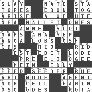 ACROSS 1. Kill 5. Nathan's nickname 9. R.R. building 12. Drinks excessively 14. Inky black, to poets 15. Coat; cloak 16. Originate 17. Medicinal plant 18. Shoshoni 19. Teachers' org. 20. Place for singles 23. Washington bills 24. Queen of England 1702-14 25. Highlander 27. Atlas contents 30. Santa ___, CA 32. Slangy assent 33. Small Philippine buffalo 34. Tennis shots 36. Order of Saint Francis (abbr.) 38. Music discs 39. _ de Janeiro 40. To free from 43. Eastern Standard Time (abbr.) 46. Prepare for publication 48. Farming town in central California 49. Before (prefix) 51. Connecticut Ivy Leaguer 52. Double curve, resembling the letter S 53. Count _ (2 wds.) 54. Whirlpool 56. Nourish 58. Sowing specialist 61. Sorrow 64. Nonscientific branch of learning 65. Unadorned 66. Rep 68. Not either 69. To provide with a ceiling 70. Street urchin 71. Bear (Spanish) 72. Lyric poems 73. Roll call or roster of names DOWN 1. Comedian Laurel of Laurel & Hardy 2. Old wives' tales, e.g. 3. Capital of Western Samoa 4. Consenting reply 5. Be tempered by heat 6. Competent 7. A girl or young woman (variant) 8. Compass dir. 9. Difficult or unusual or dangerous feat 10. Carry 11. Grows older 13. Stitched 21. Of or related to the anus 22. Poe poem 23. I made a mistake 24. White ___ sheet 26. Corporate head (abbr.) 27. Big _ 28. Added to 29. Introduce or present, as a question 31. Tolerate 35. Dirtied 37. Tree-dwelling hopper 41. Binary compound 42. Pass on 44. Drove too fast 45. Three (prefix) 47. Event that recurs at intervals 48. Myrna of the movies 50. Took place subsequently 53. Paris' subway 55. To draw with force 56. Papal veil 57. Greek god of love 59. Singer Brickell 60. Snakelike fish 61. San ____ (Riviera town) 62. A single undivided whole 63. Inactive volcano in Sicily 65. Non-commissioned officer (abbr.) 67. Slender fish