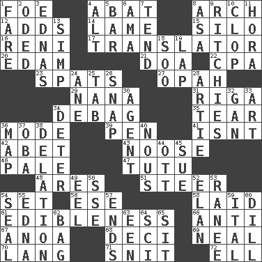 ACROSS 1. Enemy 4. Blind as ____ 8. Bowlike part 12. Does sums 14. Unable to walk 15. Grain storage tower 16. Painter Guido (1575-1642) 17. Interpreter 20. Dutch treat 21. ___ good deed 22. Accounting whiz (abbr.) 23. Arguments over trivial matters 27. Brightly colored fish 29. Grandmother 31. Capital of Latvia 34. Debunk (Brit. slang) 35. Pull into pieces 36. Method 39. Animal enclosure 41. Is not 42. Collude with 43. Trap for birds or small mammals 46. Diluted with white 47. Ballerina skirt 48. Ancient Greek god of war 51. Bull 54. Arrange properly for use 56. Compass dir. 58. Put down 61. The property of being fit to eat 66. Against 67. Small Philippine buffalo 68. Tenth: prefix 69. Be tempered by heat 70. Austrian-born American filmmaker Fritz 71. In a ____ (agitated or irritated) 72. Pipe bend DOWN 1. Conductor's collection 2. Wrote a lyric poem 3. Ferber et al. 4. The first octave above the treble staff 5. Drinking establishment 6. Nanny (var.) 7. Look after 8. White ___ sheet 9. Actors Guy, Robert Welles, and Clint 10. Hoof sound 11. Israeli folk dance 13. Simple or foolish person 18. "Barney Miller" actor Jack 19. Infant locale 24. One (Scot) 25. Bar bill 26. Fastener 28. Nick name for Arthur 30. Representative 32. Separate the seeds from cotton 33. Nonscientific branch of learning 34. Prevent from occurring 36. Atlas unit 37. Chief or king in Benin or Nigeria 38. Accusation by an informer 40. Good sense 44. Baseball player Mel 45. Institute legal proceedings 49. Snakelike fish 50. Compass dir. 52. Enthusiasm 53. The wife of a rajah (variant) 54. Lick closed 55. Pulitzer Prize-winning author Ferber 57. Extremities 59. Slanted text style (abbr.) 60. Deli pickle 62. Container for groceries 63. Car or cant ending 64. _-fi 65. Be seated