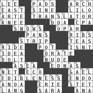 ACROSS 1. Area sheltered from the wind 4. Groovy apts. 8. Bowlike part 12. 90 degrees 14. Trig term 15. _ and Stitch 16. Johnson of "Laugh-In" 17. Interpreter 20. Leg joint 21. ___ good deed 22. Tax preparer (abbr.) 23. Overwhelms 27. Brightly colored fish 29. Zero-star reviews 31. Chest bones 34. Empty completely 35. Beverages made from leaves 36. Travel on an animal 39. Cooking vessel 41. Is not 42. The main thing one is thinking about 43. Declaim 46. Stupid person 47. Naked 48. Toward the sea 51. Ferber et al. 54. Fish or hair follower 56. Environmental prefix 58. Highlander 61. The property of being fit to eat 66. Inside; within (prefix) 67. Small Philippine buffalo 68. One of the Great Lakes 69. Proofreading order 70. Austrian-born American filmmaker Fritz 71. "Two Mules for Sister ____" 72. Santa ___, CA DOWN 1. Path through which fluid escapes 2. Merit 3. _____ Park, CO 4. Pacific Standard Time (abbr.) 5. Wind 6. Heredity factor (abbr.) 7. Transmit 8. Wing 9. Actors Guy, Robert Welles, and Clint 10. Hoof sound 11. Israeli folk dance 13. Adolescent 18. "Barney Miller" actor Jack 19. Infant locale 24. Elect 25. Armed conflict 26. Sever or remove by pinching or nipping 28. Nick name for Arthur 30. Soup utensil 32. Prohibit 33. Fast jet (abbr.) 34. Theater features 36. To free from 37. Wedding promise 38. Accusation by an informer 40. Loyal 44. Say or write further 45. Nine, plus one 49. Snakelike fish 50. Adept person 52. Matures 53. Before Barbara or Clara 54. Actress Patricia 55. Pulitzer Prize-winning author Ferber 57. Singles 59. Locale of original sin 60. Globular water bottle used in Asia 62. Container for groceries 63. Epoch 64. Title for a knight 65. Ocean
