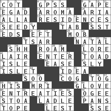 ACROSS 1. Small bed 4. Global Positioning Systems (abbr.) 8. Stare wonderingly 12. Mild oath 14. Odor 16. Operatic vocal solo 17. Silent film actress Nazimova 18. Homes 20. Morally degraded 22. Keyboard key 23. Fast jet (abbr.) 24. Begley and Asner 25. Bank Draft (abbr.) 28. Disorderly crowd 30. Russian ruler of old 31. Relating to or accompanying birth 35. Quiet! 37. Wander 40. Old wives' tales, e.g. 41. Den 42. Keyboard key 44. Frog relative 45. Capri or Wight 46. Relaxation 47. Stealthy 48. Small island 50. It may be bright or harebrained 52. "Barney Miller" actor Jack 54. Gear tooth 55. Coat; cloak 58. Part of HMS, perhaps 61. Medical imaging device (abbr.) 63. Michael Jackson trademark 65. Pleas 70. Double curve, resembling the letter S 71. Portico 72. Dipping utensil 73. Zero-star reviews 74. Drink excessively 75. For fear that 76. Compass dir. DOWN 1. Desist 2. Stared 3. Falsehoods 4. Slender fish 5. Before (prefix) 6. Distress signal 7. Stricken, poetically 8. Separate the seeds from cotton 9. Arches 10. Sliced desserts 11. 90 degrees 13. June honoree 15. First man 19. Inky black, to poets 21. Consenting reply 26. Conductor's collection 27. Heavy duty weighing machine 29. Greek mezzo-soprano Agnes 30. Threesomes 32. Implement 33. Like ___ of sunshine 34. Directed 35. Backtalk 36. Land elevation 38. _ moment's notice (2 wds.) 39. Mesonic 41. Cards in a Roman deck? 43. Do over again 49. Heavy book 51. Ovum 53. Relating to the mouth 55. Ancient Roman robes 56. Baking chambers 57. Honkers 58. Behest 59. To the inside or interior of 60. Constrict 62. Slanted text style (abbr.) 64. Chop off 66. Actress Charlotte 67. Binary compound 68. Raised railways 69. Arrange properly for use