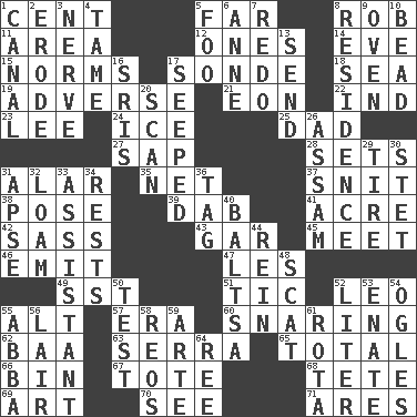 ACROSS 1. Penny 5. At a great distance 8. Director Reiner 11. Type of rug 12. Washington bills 14. Night before a holiday 15. Typical standards 17. Something which is sent 18. Ocean 19. Contrary to your interests or welfare 21. Period of immesurable duration 22. Working for oneself (abbr.) 23. Area sheltered from the wind 24. Frozen water 25. June honoree 27. Plant excrement 28. Arranges properly for use 31. Having or resembling wings 35. Fish or hair follower 37. In a ____ (agitated or irritated) 38. Introduce or present, as a question 39. Small moist lump or mass 41. 1/640 square mile 42. Backtalk 43. Slender fish 45. Confront 46. Send forth 47. French article 49. Fast jet (abbr.) 51. Nervous spasm 52. Lion 55. The first octave above the treble staff 57. Epoch 60. Catching in a trap 62. Sound made by sheep 63. Spanish missionary in California 65. "_____ Recall" 66. Storage container 67. Lug 68. False hair 69. Nonscientific branch of learning 70. Perceive with the eye 71. Ancient Greek god of war DOWN 1. Lessep's creation 2. Eat (away) 3. Effrontery 4. Not wild 5. Egg _ yung 6. Singer Murray 7. Redecorate 8. Home 9. Baking chamber 10. Necklace unit 13. Post 16. Indian titles of respect 17. Oozed 20. Glance over 26. Indian state 29. Become fatigued 30. Proofreading order 31. Domed church section 32. Rich soil 33. Aide 34. Musical pauses 36. Label 40. Greek mezzo-soprano Agnes 44. It's straight from the horse's mouth 48. Get outta here! 50. Trial 52. 61 cubic inches 53. Maternal 54. Stares 55. Swedish rock group 56. Den 58. Vintage cars 59. Johnson of "Laugh-In" 61. Round or rotation of duties 64. To sift