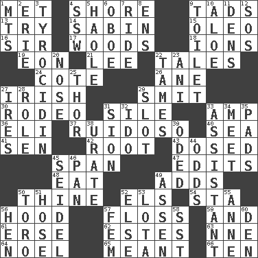 ACROSS 1. Was introduced to 4. Dinah or Pauly 9. Small amounts or degrees 13. Attempt 14. Unit of acoustic absorption 15. Margarine 16. Title for a knight 17. Forest 18. Charged atoms 19. Period of immesurable duration 21. Area sheltered from the wind 22. Stories 24. ____ d'Azur (French Riviera) 26. A saturated hydrocarbon 27. From or relating to Ireland 29. Stricken, poetically 30. Cowboy competition 31. Drop; flow; fall 33. Electrical Unit 36. Connecticut Ivy Leaguer 37. Boisterous (Brazilian Portuguese) 40. Ocean 41. Elected rep. 42. Carrot, for example 43. Administered medicine 45. Connect, as a bridge 47. Prepares for publication 48. Ingest 49. Does sums 50. One or ones belonging to thee 52. Raised railways 54. R.R. building 56. Parka part 57. Soft thread for cleaning between teeth 59. Added to 61. Celtic language 62. _____ Park, CO 63. Compass dir. 64. Christmas carol 65. Intended 66. "___ Little Indians" DOWN 1. Mountains (abbr.) 2. 4th largest of the Great Lakes 3. Polypeptide antibiotic 4. Compass dir. 5. White Person, in Hawaii 6. Mitch Miller's instrument 7. Travel on or in a vehicle 8. Followers of ems 9. Rest room 10. Medicinal plant 11. Hiding places for outlaws 12. Distress signal 20. Characteristic smell of wine 22. Softens 23. Cuckoo 25. Son of Odin 27. Angers 28. Hero or heavy, e.g. 29. Narrow opening 31. The Jewish people; Israel 32. Wedding promise 33. Helper 34. Rendezvous 35. Groovy apts. 38. A salt of uric acid 39. Wrote a lyric poem 44. Probability 45. Beer mug 46. Baking dish 49. NE Netherlands city 50. "Corrida" creature 51. Flexible conduit 52. Otherwise 53. Globular water bottle used in Asia 55. Queen of England 1702-14 56. Layer 57. Opposite of masc. 58. Fast jet (abbr.) 60. Lair