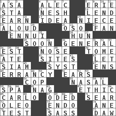 ACROSS 1. White ___ sheet 4. Actor Baldwin 8. One of the Great Lakes 12. R.R. building 13. Delicate 14. Grant temporary use of 15. Merit 17. The main thing one is thinking about 18. Sibling's daughter 19. Verbally 21. Bear (Spanish) 23. Avid follower 24. World-weariness 26. Attila the _ 28. Within a short period 30. Commissioned military rank 34. Eastern Standard Time (abbr.) 37. Sense of smell 39. Heavy book 40. Had dinner 41. Locates 43. Allow 44. Thailand, formerly 46. System (abbr.) 47. Followers of ems 48. The state or an instance of erring 51. Hearing organs 54. Police officer (slang) 55. Rhinal 58. Health resort 61. Tired old horse 63. Moral principle 65. Monte _, Las Vegas Hotel/Casino 67. Wrote a lyric poem 71. Burn superficially 72. Butter sub 73. Inside; within (prefix) 74. One (Scot) 75. Trial 76. Backtalk 77. Simpleton DOWN 1. At sea 2. Having lost freshness 3. Composer Copland 4. Black tropical American cuckoo 5. Directed 6. Compass dir. 7. US Secretary of Labor Elaine L. _ 8. Connecticut Ivy Leaguer 9. Coral collection 10. South American Indian 11. Paradise 16. Religious women 18. Part of speech 20. Superhero pair 22. A female animal or person 25. Charged atoms 27. Remaining after all deductions 29. Annoyingly loud 30. Honkers 31. Hero or heavy, e.g. 32. So be it 33. Allows 34. Relaxation 35. Disorderly outburst 36. Separate forcefully 38. Filthy place 42. Comedian Laurel of Laurel & Hardy 45. Apple computer (short form) 49. Words to Nanette 50. Numbers guy (abbr.) 52. Actress Charlotte 53. Fast planes 56. Having the leading position 57. Climbing, woody, usually tropical vines 58. Native of Scotland 59. Light colored 60. Ancient Greek god of war 62. Moves 64. Group working together 66. Car dealer's back yard 68. Heredity factor (abbr.) 69. Begley and Asner 70. Two (Sp.)