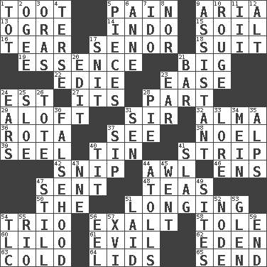 ACROSS 1. A blast of a horn 5. Ache 9. Operatic vocal solo 13. Legendary monster 14. Southeast Asian peninsula 15. Land 16. Rend 17. Sir (Sp.) 18. Set of matching outer garments 19. Center 21. Of large size 22. Singer Brickell 23. Relaxation 24. Eastern Standard Time (abbr.) 27. It is 28. Component 29. High up in or into the air 31. Title for a knight 32. _ mater 36. Round or rotation of duties 37. Observe 38. Christmas carol 39. Sew up the eyelids of hawks and falcons 40. Metal container 41. Remove all contents or possession from 42. Clip 44. Leather borer 46. Followers of ems 47. Emitted 48. Beverages made from leaves 50. Definite Article 51. Yearning 54. Musical group of three 56. Glorify 58. Lacquered or enameled metalware 60. _ and Stitch 61. Tending to cause great harm 62. Locale of original sin 63. Having a low temperature 64. Flaplike coverings 65. Transmit DOWN 1. Small child 2. Double curve, resembling the letter S 3. Mouths or openings 4. Laconic 5. Components 6. Queen of England 1702-14 7. Wedding promise 8. Not either 9. Aide 10. Makeup applied to the cheeks 11. One more than two 12. Keyboard modifier key 17. In a ____ (agitated or irritated) 20. Prepare for publication 21. Oblong piece of solid material 23. Hearing organ 24. Hearing organs 25. A type of plum 26. Lug 28. Sliced dessert 30. It jiggles the polygraph 31. Elected rep. 33. Old wives' tales, e.g. 34. Count _ (2 wds.) 35. High mountains 37. Small drink 40. Teat (slang) 41. Volcanic refuse 43. Compass dir. 44. Ringlike coral islands and reefs 45. Left 47. Free of sound 49. Locates 51. Put down 52. Thickened enlargement 53. Small, secluded valley 54. Affectionate concern, for short 55. River (Sp.) 56. Snakelike fish 57. 16 59. Conclusion