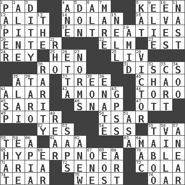 ACROSS 1. Writing tablet 4. First man 8. Peachy ____! 12. Set down 14. Pitcher Ryan 16. Inventor's middle name 17. Heart or essence 18. Pleas 20. Keyboard key 22. Shade tree 23. Eastern Standard Time (abbr.) 24. Marina Del _, California 25. Layer 28. 54 in ancient Rome 30. Printing process, for short 31. Flat circles 35. "One Day ___ Time" 37. Family _ (genealogy) 40. US Secretary of Labor Elaine L. _ 41. Having or resembling wings 42. Amid 44. "Corrida" creature 45. Indian skirt 46. Fastener 47. Baseball player Mel 48. Peter (Polish) 50. Russian ruler of old 52. Consenting reply 54. Double-curved letter 55. Federal power corp. 58. Beverage made from leaves 61. Auto club (abbr.) 63. At full speed 65. Abnormally rapid or deep breathing 70. Competent 71. Roberta Peters solo 72. Sir (Sp.) 73. Root beer relative 74. Separate forcefully 75. 270 degrees 76. Boat paddle DOWN 1. Some stationery 2. Place in a line 3. Short, simple song 4. A saturated hydrocarbon 5. Spanish title 6. Keyboard modifier key 7. Female horse 8. Krazy ___ of comics 9. Writer Wiesel 10. Nights before holidays 11. Political cartoonist Thomas 13. Definite Article 15. 1994 drama film starring Jodie Foster 19. Among 21. 17th letter of the Greek alphabet 26. Singer James 27. Typical models 29. Winning man's name 30. Noteworthy scarcity 32. Guess 33. Draw slowly or heavily 34. "Barney Miller" actor Jack 35. Jai ____ 36. Edible starchy tuberous root 38. Period of immesurable duration 39. Related on the mother's side 41. Cleo's killer 43. Global Positioning Systems (abbr.) 49. Hitchcock's "____ Window" 51. White ___ sheet 53. Plant excrements 55. Off limits 56. Country estate 57. Approach 58. Not this but _ 59. Jane of fiction 60. Capital of Western Samoa 62. Afresh 64. Apple computer (short form) 66. Hearing organ 67. Single 68. Greek goddess of the dawn 69. Tate display