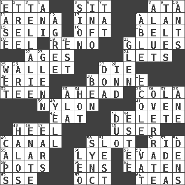 ACROSS 1. Singer James 5. Be seated 8. "One Day ___ Time" 11. Sports stadium 13. _ tizzy (2 wds.) 14. Actor Alda or Thicke 15. Former Milwaukee Brewers owner Bud 16. Often (poetically) 17. Waist strap 18. Snakelike fish 19. Western Nevada city 21. Adhesives 22. Ripens 24. Allows 25. Place for singles 27. Pass on 29. 4th largest of the Great Lakes 30. Child's nurse 32. Adolescent 33. Having the leading position 35. Root beer relative 39. High-strength synthetic material 41. Baking chamber 42. Consume 43. Erase 45. The bottom of a shoe or boot 48. One who makes use of a thing 49. Lessep's creation 50. Position in a hierarchy or organization 52. To free from 55. Having or resembling wings 56. Sodium hydroxide 57. Dodge 59. Plant holders 60. Followers of ems 61. Eroded 62. Compass dir. 63. Sep. follower 64. Afternoon social gatherings DOWN 1. Comfort 2. Relationship diagram 3. Copy Pinocchio 4. Cuckoo 5. The Jewish people; Israel 6. A message received and understood 7. Make lace 8. Native American of Southwest Alaska 9. Stories 10. Pismires 12. Match 14. Competent 20. Eastern Standard Time (abbr.) 21. Small, secluded valley 23. American astronaut and politician John 25. Dripping 26. "We ___ not amused" (Victoria) 27. ___ good deed 28. Working for oneself (abbr.) 30. Benjamin's nick name 31. Learning spot: Fr. 33. According to 34. Being at a high temperature 36. Make much ado about nothing 37. Allow 38. One (Scot) 40. Shout 43. Superhero pair 44. First name in cosmetics 45. Radiant circles of light 46. Maternal 47. Hearing organs 49. Smile enhancers 50. Synchronize (abbr.) 51. For fear that 53. The main thing one is thinking about 54. Habitations of wild animals 56. Lion 58. Large container