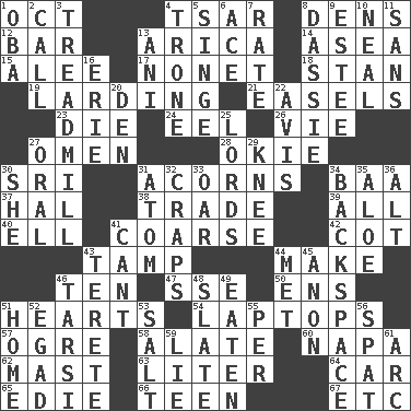 ACROSS 1. Sep. follower 4. Russian ruler of old 8. Lairs 12. Oblong piece of solid material 13. N. Chile seaport 14. At sea 15. Toward shelter 17. Music written for nine 18. Comedian Laurel of Laurel & Hardy 19. Preparing or cooking with lard 21. Artist's stands 23. Expire 24. Snakelike fish 26. Compete 27. Presage 28. Migrant worker of the '30s 30. _ Lanka 31. Oak nuts 34. Sound made by sheep 37. Actor Linden 38. Buy and sell 39. 100% 40. Pipe bend 41. Rough 42. Small bed 43. Pack (down) 44. Cause to be 46. "___ Little Indians" 47. Compass dir. 50. Followers of ems 51. Centers of feelings and intuitions 54. Portable computers 57. Legendary monster 58. Having winglike extensions 60. California wine valley 62. Vertical spar for supporting sails 63. 61 cubic inches 64. 4-wheeled motor vehicle 65. Singer Brickell 66. Adolescent 67. And so on (abbr.) DOWN 1. Chief or king in Benin or Nigeria 2. Give a ring to 3. Excercise machine 4. Marketplace scale 5. Burn superficially 6. Adept person 7. Pace 8. Small ungulate mammals of Africa 9. First name in cosmetics 10. Anneal 11. Without 13. Cuckoo 16. 4th largest of the Great Lakes 20. Lair 22. Opinion 25. Titled peers of a realm 27. Taken by mouth 29. Leg joint 30. A female animal or person 31. Tiny particle 32. Dice game 33. Boat paddle 34. Keyboard key 35. _ vera 36. Keyboard modifier key 41. Patter 43. Cigar-shaped 44. Was introduced to 45. Soon (poet.) 46. Tarsus (plural) 48. Schedule 49. Eroded 51. Residence 52. Mild oath 53. Table seasoning 55. For each 56. Argument over a trivial matter 59. Untruth 61. Curve
