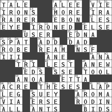 ACROSS 1. Falsehood 5. Toward shelter 9. Compete 12. Removes the wrinkles 14. Greater amount 15. Retirement account (abbr.) 16. More uncommon 17. Inky black, to poets 18. French article 19. Sight organ 20. Pressed 23. Otherwise 24. One who makes use of a thing 25. Pulitzer Prize-winning author Ferber 27. Petty quarrel 30. Say or write further 32. June honoree 33. Loose flowing garment 34. 480, 500 or 516 sheets of paper 36. Science/research agcy. 38. One more than two 39. One (Scot) 40. Santa ___, CA 43. Three (prefix) 46. For fear that 48. Afresh 49. Begley and Asner 51. Compass dir. 52. Instrument 53. Small Philippine buffalo 54. Singer James 56. 1/640 square mile 58. College papers 61. Infant locale 64. Part of a journey 65. Chop _ 66. Scent 68. By way of 69. Celtic language 70. "The Thinker" sculptor 71. Everything 72. Pismires 73. Auction offers DOWN 1. Become fatigued 2. Like ___ of sunshine 3. Old wives' tales, e.g. 4. Compass dir. 5. So be it 6. Ear part 7. Worn away 8. Car or cant ending 9. Country estate 10. Angers 11. Relaxation 13. Indian titles of respect 21. Bring up, as a child 22. Severe or trying experience 23. Extremities 24. Shoshoni 26. One of the 12 tribes of Israel 27. _ Lanka 28. Luau course 29. "This won't hurt ____!" 31. Natives or inhabitants of Denmark 35. Makes clutter 37. Papal veil 41. Modern: prefix 42. Leather borer 44. French philosopher Descartes 45. Wedding promise 47. Wig 48. _ moment's notice (2 wds.) 50. Titan orbits this 53. Therefore, facetiously 55. Russian ruler of old 56. Inventor's middle name 57. To provide with a ceiling 59. Command 60. Snake ____ (dice throw) 61. Farming town in central California 62. Among 63. Zero-star reviews 65. Ocean 67. Director Reiner