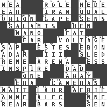 ACROSS 1. Teachers' org. 4. Hero or heavy, e.g. 8. Ancient Persian 12. Hearing organ 13. SW Asia republic 14. Allodial 15. Greek mythologigal hunter 18. Stare wonderingly 19. Elected reps. 20. Deli grouping 22. Layer 23. Billionth: prefix 24. Erode 25. Distant 26. Electrical Measurement 30. Plant excrement 33. _____ Park, CO 36. Inky black, to poets 37. The sixth month of the Jewish calendar 39. One more than two 40. Downhill vehicle 41. French philosopher Descartes 42. Sports stadium 44. Double-curved letter 45. Heighten or intensify 47. June honoree 50. Single 51. Like ___ of sunshine 53. Period 54. Devices for capturing images 57. Electrical Unit 59. Cowardly lion portrayer 61. Nest on high 63. Singer Murray 64. Actor Baldwin 65. Compass dir. 66. Tail end 67. Oblong pieces of solid material 68. Elected rep. DOWN 1. Modern: prefix 2. Hearing organs 3. Believer in; advocate of (suffix) 4. Swiss mountan, "Queen of the Mountains" 5. Mouths or openings 6. Infant locale 7. Compass dir. 8. French bagpipes 9. Genesis locale 10. Daniel's nick name 11. Raised railways 16. Norwegian king 17. Nanny 21. Greater amount 22. Actor Linden 24. Greek goddess of the dawn 26. Distinctive style or manner 27. Competent 28. Leaves 29. Extremities 30. Indian skirt 31. Arabian gulf 32. Zero-star reviews 34. The founder of a family 35. Neckwear 38. Newsperson 42. "We ___ not amused" (Victoria) 43. First man 46. _ tizzy (2 wds.) 48. Length times width 49. Have the gumption 52. Entertaining tales 53. Inactive volcano in Sicily 54. "Mermaids" star 55. Arches 56. Trig term 57. Armed conflict 58. One (Scot) 59. Experiment locale 60. Chicken ___ king 62. Car or cant ending