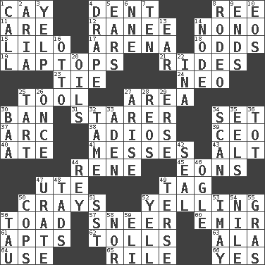 ACROSS 1. Island 4. Undesirable depression on a surface 8. To sift 11. "We ___ not amused" (Victoria) 12. The wife of a rajah (variant) 14. Words to Nanette 15. _ and Stitch 17. Sports stadium 18. Probability 19. Portable computers 21. Amusement-park features 23. Standoff 24. Modern: prefix 25. Instrument 27. Type of rug 30. Bar 31. A viewer who gazes fixedly 34. Arrange properly for use 37. Curve 38. Goodbye (Sp.) 39. Corporate head (abbr.) 40. Had dinner 41. Makes clutter 43. The first octave above the treble staff 44. French philosopher Descartes 45. Immeasurably long periods of time 47. Shoshoni 49. Label 50. Trading vessels 52. Crying or shouting loudly 56. Frog relative 57. Contemptuous expression 60. Arab leader 61. Tenement units (abbr.) 62. For Whom the Bell _____ 63. According to 64. Purpose 65. Cause heat under the collar 66. Consenting reply DOWN 1. Give a ring to 2. Roberta Peters solo 3. Sharp bark 4. Window treatment 5. Hearing organs 6. Compass dir. 7. Nine, plus one 8. Cowboy competition 9. Conclusions 10. Greek goddess of the dawn 13. Ewer handle 14. Thickened enlargement 16. Von Bismarck 20. Petroleums 22. _ tizzy (2 wds.) 25. Small pie 26. At one time in the past 27. Get up 28. Vintage cars 29. Celtic language 30. Sound made by sheep 32. Docile 33. Arabian gulf 34. Examine minutely or intensely 35. Snakelike fish 36. Small child 42. Lick closed 44. Marina Del _, California 46. Stare 47. A salt of uric acid 48. Small boys 49. Laconic 50. 911 reaches them 51. Fast jet (abbr.) 52. Shout 53. "If ____ say so..." 54. "Death on the ____" 55. Pate de foie ____ 56. The 19th letter of the Greek alphabet 58. And not 59. Biblical high priest