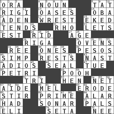 ACROSS 1. Mouth or opening 4. Part of speech 8. Make lace 11. Swiss mountan, "Queen of the Mountains" 13. Fertile tracts in a desert 15. Chief or king in Benin or Nigeria 16. An important port of Yemen 17. Take or capture by force 18. Made supply last 19. Watches over 21. 17th letter of the Greek alphabet 22. Allows 23. Eastern Standard Time (abbr.) 24. To free from 27. Mature 29. Capital of Latvia 30. Baking chambers 34. To riddle 36. Washington bills 39. Mexican monetary units 40. Simple or foolish person 41. Musical pauses 43. Political cartoonist Thomas 44. Goodbye (Sp.) 46. Lick closed 47. Third day of the wk. 48. _ dish (used to culture cells) 49. "Silly old bear" 51. Three (prefix) 53. Layer 54. Fish or hair follower 57. Helper 60. Cartoonist voice _ Blanc 63. Wear away 65. Disorderly outburst 66. A-one 69. Having or resembling wings 70. Possessed 71. Underwater navigation system 72. Friends 73. Biblical high priest 74. Stalk of a moss capsule 75. Born DOWN 1. Declaim 2. Amusement-park features 3. Rep 4. At this time 5. Rowing implement 6. One who makes use of a thing 7. Tender 8. Casino tip 9. Collude with 10. Small amounts or degrees 12. Working for oneself (abbr.) 14. Portico 18. Veterans Day date 20. Indian title of respect (Mr.) 25. Composer Stravinsky 26. Natives or inhabitants of Denmark 28. Grand Old Party 29. News announcer 31. Son of Isaac 32. Characteristic smell of wine 33. Fast jet (abbr.) 34. Travel on or in a vehicle 35. Send forth 37. Compass dir. 38. Staphylococcus 40. Plant excrement 42. A type of plum 45. Title for a knight 50. Single 52. Naughty children 54. Pitcher Ryan 55. Peak District village in England 56. Laconic 57. American tennis player Robert 58. Slanted text style (abbr.) 59. "You Light Up My Life" star Conn 61. Greek god of love 62. Actor's bit 64. Reproach for some lapse or misdeed 67. Floor protector 68. Epoch