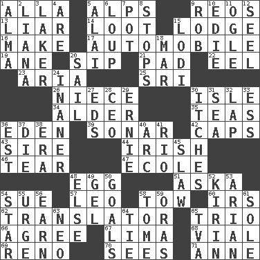 ACROSS 1. Silent film actress Nazimova 5. High mountains 9. Vintage cars 13. One who doesn't tell the truth 14. Spoils 15. Cabin 16. Create 17. Form of transportation 19. A saturated hydrocarbon 20. Small drink 21. Groovy apt. 22. Snakelike fish 23. Operatic vocal solo 25. _ Lanka 26. Sibling's daughter 30. Small island 34. Tree or shrub in the Birch family 35. Afternoon social gatherings 36. Genesis locale 39. Echolocation 42. Smile enhancers 43. Male parent of an animal 44. From or relating to Ireland 46. Separate forcefully 47. Learning spot: Fr. 48. Ovum 51. "____ silly question..." 54. Take to court 57. Lion 58. Pull behind 60. Big collection agency 62. Interpreter 65. Musical group of three 66. Match 67. Pale green bean 68. Small bottle 69. Former U.S. Attorney General Janet 70. Perceives with the eye 71. Singer Murray DOWN 1. _ mater 2. Woody, climbing, usually tropical plant 3. Member of a famous L.A. basketball team 4. "We ___ not amused" (Victoria) 5. Jai ____ 6. Central Nebraska county 7. Plant holder 8. Halts 9. Director Reiner 10. Singer Brickell 11. Stare at amorously 12. Stitch closed the eyes of (a falcon) 15. Farming town in central California 18. Impair 20. Move on water 24. Sillier 27. Begley and Asner 28. Corporate head (abbr.) 29. Bert's buddy 30. Skin irritations 31. Ocean 32. Infant locale 33. Curvy letter 36. Eastern Standard Time (abbr.) 37. Pass on 38. Period 40. Curve 41. _ de Janeiro 45. Cole _ (cabbage dish) 48. Otherwise 49. Set 50. Finish lines 52. Japanese brewing company 53. Believer in; advocate of (suffix) 54. Play the lead 55. Goad 56. Merit 58. Heavy book 59. Mouths or openings 61. Flatfish 63. Modern: prefix 64. Neckwear 65. Federal power corp.