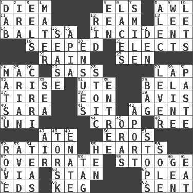 ACROSS 1. South Vietnam president (1954) 5. Raised railways 8. Leather borer 11. Length times width 12. 480, 500 or 516 sheets of paper 13. Area sheltered from the wind 14. Greek mezzo-soprano Agnes 17. Happening 19. Oozed 21. Opts 22. Precipitation 23. Elected rep. 24. Big _ 27. Backtalk 29. Infant locale 32. Get up 34. Shoshoni 36. Actor Lugosi 37. Hoop that covers a wheel 38. Period of immesurable duration 39. Opinion 40. "Two Mules for Sister ____" 41. Be seated 42. Rep 43. Single; one (prefix) 44. Riding implement 46. To sift 47. Had dinner 50. Greek god of love 52. Food allowance for one day 55. Centers 57. Make much ado about nothing 59. Moe Howard, for one 62. By way of 63. Comedian Laurel of Laurel & Hardy 64. Entreaty 65. Begley and Asner 66. Barrel 67. Emitted DOWN 1. Pat or tap gently 2. Retirement account (abbr.) 3. Snakelike fish 4. Mother 5. Car or cant ending 6. Shoestrings 7. Grin 8. Actor Baldwin 9. Left 10. Allows 12. To free from 15. Gospel singer Marvin 16. Capital of Western Samoa 18. Lair 20. Takes place subsequently 24. Taiwanese island in East China Sea 25. Believer in; advocate of (suffix) 26. High-altitude cloud 28. Unemotional 29. Crowbar 30. Place in a line 31. Thick mixture 33. Ocean 35. Main course 36. Container for groceries 42. To the left, to Queeg 45. Mouths or openings 47. Wind 48. Cod relative 49. Maternal 51. Ceases 52. Be footloose 53. Enthusiastic 54. Afternoon social gatherings 55. Layer 56. Not divided or shared with others 58. Label 60. Commissioned military rank (abbr.) 61. Ingest
