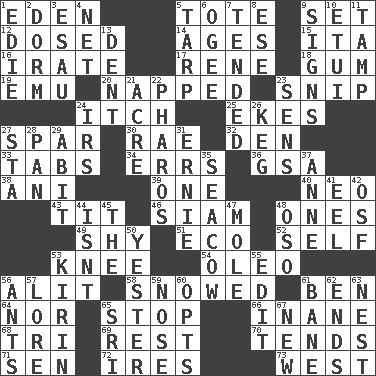 ACROSS 1. Locale of original sin 5. Carryall 9. Put into a specified state 12. Administered medicine 14. Matures 15. Call ___ day 16. Feeling or showing extreme anger 17. French philosopher Descartes 18. Chewing product 19. Australian flightless bird 20. Slept 23. Sever or remove by pinching or nipping 24. Hankering 25. Makes supply last 27. Coast Guard woman 30. Actress Charlotte 32. Lair 33. Bar bills 34. Blunders 36. Girls' org. (abbr.) 38. Cuckoo 39. Single 40. Modern: prefix 43. Teat (slang) 46. Thailand, formerly 48. Washington bills 49. Like a shrinking violet 51. Environmental prefix 52. Automatically 53. Leg joint 54. Butter sub 56. Set down 58. Frozen precipiation fell 61. Benjamin's nick name 64. And not 65. Halt 66. Empty; void 68. Three (prefix) 69. State of inaction 70. Watches over 71. Elected rep. 72. Angers 73. Compass direction DOWN 1. Singer Brickell 2. Dormintory (informal) 3. Son of Isaac 4. Fish or hair follower 5. Canvas cover 6. Double curve, resembling the letter S 7. Watched over 8. Compass dir. 9. Signals 10. Needle case 11. Pack (down) 13. Undesirable depression on a surface 21. Measure of real estate 22. N Egypt peninsula 23. Elected reps. 24. Big collection agency 26. Barrel 27. R.R. building 28. Baking dish 29. "This won't hurt ____!" 31. Bert's buddy 35. Manatee 37. Queen of England 1702-14 41. Snakelike fish 42. Order of Saint Francis (abbr.) 44. Is not 45. Definite Article 47. Undercover agent 48. Bear (Spanish) 50. Last 53. Japanese brewing company 55. Prepare for publication 56. Pismires 57. Old wives' tales, e.g. 59. Sense of smell 60. Chooses 61. Object of repulsion 62. Extremities 63. A home for chicks 65. _ Lanka 67. ___ Haven, CT