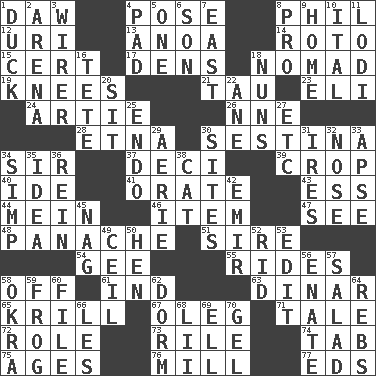 ACROSS 1. Obsolete 4. Airs 8. Silvers or Donahue 12. RI univ. 13. Small Philippine buffalo 14. Printing process, for short 15. Certainty 17. Hiding places for outlaws 18. Roamer 19. Leg joints 21. The 19th letter of the Greek alphabet 23. Connecticut Ivy Leaguer 24. Nick name for Arthur 26. Compass dir. 28. Inactive volcano in Sicily 30. French poetic form 34. Title for a knight 37. Tenth: prefix 39. Riding implement 40. Binary compound 41. Declaim 43. Curvy letter 44. Chow _ 46. Detail 47. Observe 48. Flamboyance 51. Male parent of an animal 54. Turn to the right 55. Amusement-park features 58. Not in operation 61. Indiana (abbr.) 63. Middle Eastern gold or silver currency 65. The principal food of baleen whales 67. Cassini of fashion 71. Story 72. Hero or heavy, e.g. 73. Cause heat under the collar 74. Keyboard key 75. Eons 76. Place where flour is made 77. Begley and Asner DOWN 1. Evade 2. Sports stadium 3. One who wires 4. Writing tablet 5. Single 6. Manchild 7. 90 degrees 8. Adept person 9. Dwelling 10. Slanted text style (abbr.) 11. Farming town in central California 16. Wig 18. Religious women 20. Be seated 22. A saturated hydrocarbon 25. Inside; within (prefix) 27. And so on (abbr.) 29. Nest on high 30. Locates 31. Angers 32. Characteristic smell of wine 33. Domed church section 34. Simple or foolish person 35. The main thing one is thinking about 36. It's straight from the horse's mouth 38. Domesticated feline 42. Arab leader 45. Tired old horse 49. To provide with a ceiling 50. Layer 52. To free from 53. Prepare for publication 56. Maternal 57. First course 58. Gumbo ingredient 59. Tree-dwelling hopper 60. Do some clerical work 62. Dormintory (informal) 64. Confederate soldiers (slang) 66. French article 68. Cards in a Roman deck? 69. Pipe bend 70. Set