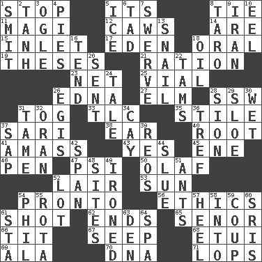 ACROSS 1. Constrict 5. ___ a Wonderful Life 8. Standoff 11. Wise men 12. Crow sounds 14. "We ___ not amused" (Victoria) 15. An arm off of a larger body of water 17. Locale of original sin 18. Relating to the mouth 19. College papers 21. Food allowance for one day 23. Remaining after all deductions 25. Small bottle 26. Pulitzer Prize-winning author Ferber 27. Shade tree 28. Compass dir. 31. Coat; cloak 33. Affectionate concern, for short 35. Vertical member of a panel or frame 37. Indian skirt 38. Ewer handle 40. Carrot, for example 41. Collect or gather 43. It is so 45. Compass dir. 46. Animal enclosure 47. Air pressure measure (abbr.) 50. Norwegian king 52. Den 53. Player for Phoenix 54. Right away 56. Value system 61. Attempt 62. Conclusions 65. Sir (Sp.) 66. Teat (slang) 67. Ooze 68. Needle holder 69. Wing 70. Heredity factor (abbr.) 71. Chops off DOWN 1. Stricken, poetically 2. Hyperbolic tangent 3. Stare at amorously 4. Sliced desserts 5. Frozen water 6. Small amount or degree 7. Turn aside suddenly 8. Pacific island yam 9. SW Asia republic 10. Snakelike fish 13. Slow-paced one 16. Be inclined (to) 18. Petroleum 20. Transmitted 22. Scottish caps 24. Falsehood 26. The front part of a cuirass 28. The Jewish people; Israel 29. _ gin 30. Dripping 31. Docile 32. NW Algerian seaport 34. Island 36. Unclean, religiously 37. Plant excrement 39. Vintage cars 42. Connect, as a bridge 44. Turn sharply 48. Settings 49. Pressed 51. Pismires 52. Car dealer's back yard 54. Silvers or Donahue 55. Round or rotation of duties 57. Person who is morally reprehensible 58. To the inside or interior of 59. Overturn; upset 60. Indian titles of respect 61. R.R. building 63. Lair 64. Health resort