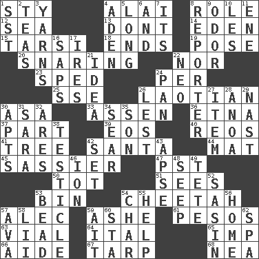 ACROSS 1. Filthy place 4. Jai _ 8. Hero or heavy, e.g. 12. Ocean 13. Do not 14. Genesis locale 15. Tarsus (plural) 18. Conclusions 19. Introduce or present, as a question 20. Catching in a trap 22. Not either 23. Drove too fast 24. For each 25. Compass dir. 26. Of or relating to Laos or its people 30. White ___ sheet 33. NE Netherlands city 36. Inactive volcano in Sicily 37. Piece 39. Greek goddess of the dawn 40. Vintage cars 41. Relationship diagram 42. Before Barbara or Clara 44. Floor covering 45. More lively and spirited 47. Pacific Standard Time (abbr.) 50. Small child 51. Perceives with the eye 53. Storage container 54. Leopard's kin 57. Actor Baldwin 59. American tennis player Robert 61. Mexican monetary units 63. Small bottle 64. Slanted text style (abbr.) 65. Naughty child 66. Assistant 67. Canvas cover 68. Teachers' org. DOWN 1. Fast jet (abbr.) 2. Afternoon social gatherings 3. Entertaining tales 4. Arabian gulf 5. Having great length 6. Added to 7. It is 8. Newsperson 9. Scent 10. French article 11. Compass dir. 16. Plant excrements 17. Angers 21. It may be bright or harebrained 22. Modern: prefix 24. Baking dish 26. For fear that 27. Detail 28. Small Philippine buffalo 29. Political cartoonist Thomas 30. Flats, for short 31. "Two Mules for Sister ____" 32. Ancient Greek god of war 34. Shrivel 35. Manchild 38. One of the two male reproductive glands 42. Put into a specified state 43. Domed church section 46. Electrically charged atom 48. Ooze 49. False hair 52. Indian antelope 53. Necklace unit 54. Burn to charcoal 55. Aid 56. Dwelling 57. Actress Gardner 58. Cards in a Roman deck? 59. Small island 60. R.R. building 62. Health resort