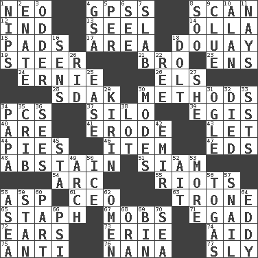 ACROSS 1. Modern: prefix 4. Global Positioning Systems (abbr.) 8. Examine hastily 12. Working for oneself (abbr.) 13. Stitch closed the eyes of (a falcon) 14. Rounded earthenware pot or jar 15. Writing tablets 17. Length times width 18. A city in N France, SE of Calais 19. Navigate 21. Sis' sibling 23. Followers of ems 24. Bert's buddy 26. Raised railways 28. Neighbor of Neb. 30. Modes 34. Personal Computers (abbr.) 37. Grain storage tower 39. Armor plate that protects the chest 40. "We ___ not amused" (Victoria) 41. Eat (away) 43. Allow 44. Sliced desserts 46. A whole individual unit 47. Begley and Asner 48. Refrain by choice 51. Thailand, formerly 54. Curve 55. Debaucheries 58. Cleo's killer 61. Corporate head (abbr.) 63. Heavy duty weighing machine 65. Staphylococcus 67. Disorderly crowds 71. Mild oath 72. Hearing organs 73. 4th largest of the Great Lakes 74. Assist 75. Against 76. Nanny 77. Insidious DOWN 1. Cuts off 2. Maternal 3. More peculiar 4. Girls' org. (abbr.) 5. For each 6. Observe 7. Broad, flat, thick piece 8. "Barney Miller" actor Jack 9. A slight indication 10. ____ Jay Lerner 11. Negative votes 16. Elected reps. 18. Dunce 20. To free from 22. To riddle 25. Comfort 27. A female animal or person 29. Japanese brewing company 30. Methods 31. Stare 32. Passed on 33. Fast planes 34. Dad 35. Baby bed with high sides 36. Perceives with the eye 38. Car dealer's back yard 42. Independent ruler or chieftain 45. R.R. building 49. Bowlike part 50. Frozen water 52. Small island 53. Greater amount 56. Ancient Roman robes 57. Slow-paced one 58. Toward the sea 59. Comedian Laurel of Laurel & Hardy 60. Piece 62. Sign of things to come 64. Whirlpool 66. 23rd letter of the Greek alphabet 68. Mouth or opening 69. Storage container 70. Ocean