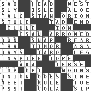ACROSS 1. Saxophone 4. Froth on beer 8. 270 degrees 12. Mischievous 13. Small island 14. _ vera 15. Baby powder 17. Comedian Laurel of Laurel & Hardy 18. Constellation of myth 19. Took without asking 21. Small boy 23. Conclude 24. Dodge 26. Electrically charged atom 28. Son of Isaac 30. Moved like an arrow 34. Spanish title 37. Fastener 39. Bring up, as a child 40. Retirement account (abbr.) 41. Southeast Indonesia island 43. White ___ sheet 44. 24-hour periods 46. Edible starchy tuberous root 47. Part of a journey 48. Heighten or intensify 51. Drink excessively 54. Alias (abbr.) 55. Laconic 58. Trim (branches) 61. Choose 63. Parts of speech 65. The state of being joined or united 67. Lyric poems 71. Trig term 72. Confront 73. General guideline 74. Third day of the wk. 75. Inconspicuous attention getter 76. Root beer relative 77. Small drink DOWN 1. Fast planes 2. Having winglike extensions 3. Xylene (variant) 4. Part of HMS, perhaps 5. Eastern Standard Time (abbr.) 6. According to 7. Undesirable depression on a surface 8. Armed conflict 9. Writer Wiesel 10. Within a short period 11. Watch over 16. A slight indication 18. Aroma 20. Begley and Asner 22. Atmosphere 25. 90 degrees 27. Not either 29. Join together 30. To the left, to Queeg 31. Welt 32. Relaxation 33. To trail on the ground 34. "You Light Up My Life" star Conn 35. NW Algerian seaport 36. Negative votes 38. Nursemaid (var.) 42. Carrot, for example 45. Health resort 49. Image 50. Strike 52. Fenced enclosure 53. Greek god of love 56. Sets of matching outer garments 57. World-weariness 58. Mass 59. Washington bills 60. Sliced desserts 62. Torque (variant) 64. Ooze 66. Baseball player Mel 68. Superhero pair 69. Pipe bend 70. Ocean