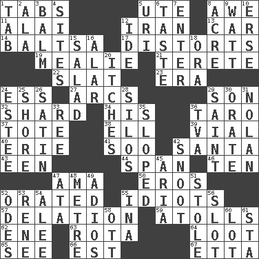 ACROSS 1. Bar bills 5. Shoshoni 8. Deep reverence 11. Mountain range southwest of Kyrgyzstan 12. SW Asia republic 13. Automobile 14. Greek mezzo-soprano Agnes 17. What propaganda does 19. Ear of corn 21. Cigar-shaped 22. Narrow board 23. Epoch 24. Curvy letter 27. Arches 29. Male offspring 32. Pottery fragment 34. Part of HMS, perhaps 36. Edible starchy tuberous root 37. Carry 38. Pipe bend 39. Small bottle 40. One of the Great Lakes 41. "Barney Miller" actor Jack 42. Before Barbara or Clara 43. Car or cant ending 44. Connect, as a bridge 46. "___ Little Indians" 47. Nanny (var.) 50. Greek god of love 52. Spoke pompously 55. Foolish or stupid persons 57. Accusation by an informer 59. Ringlike coral islands and reefs 62. Compass dir. 63. Roll call or roster of names 64. Spoils 65. Perceive with the eye 66. Eastern Standard Time (abbr.) 67. Singer James DOWN 1. Bar bill 2. According to 3. Lip ointment 4. Locates 5. RI univ. 6. Clothes sense 7. Keyboard key 8. 43,560 square feet 9. Electrical Unit 10. Celtic language 12. Binary compound 15. First course 16. Having or resembling wings 18. Mouth or opening 20. Skin irritations 24. First name in cosmetics 25. Dinah or Pauly 26. Smooth fabric 28. Grain storage towers 29. Inhabitant of Heaven 30. Speak pompously 31. Pitcher Ryan 33. To sift 35. Slanted 36. Federal power corp. 42. Snout, nose 45. Roberta Peters solo 47. _ moment's notice (2 wds.) 48. Distance measurement (Brit.) 49. Goodbye (Sp.) 51. Fur scarf 52. Lyric poems 53. French philosopher Descartes 54. Toward shelter 55. _ tizzy (2 wds.) 56. Narrow opening 58. Baseball player Mel 60. Car dealer's back yard 61. R.R. building