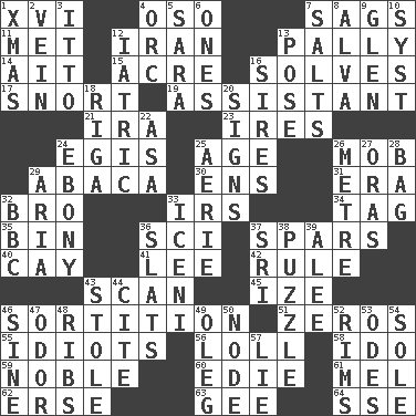 ACROSS 1. 16 4. Bear (Spanish) 7. Sinks 11. Was introduced to 12. SW Asia republic 13. Chummy 14. Small island 15. Measure of real estate 16. Finds the solution 17. Derisive sound 19. Aide 21. Retirement account (abbr.) 23. Angers 24. The front part of a cuirass 25. Mature 26. Crowd into 29. Phillipine bananalike plant 30. Followers of ems 31. Period 32. Sis' sibling 33. Big collection agency 34. Label 35. Storage container 36. _-fi 37. Practice fights 40. Island 41. Area sheltered from the wind 42. General guideline 43. Glance over 45. Ending with capital 46. Conclusion 51. Nothings 55. Foolish or stupid persons 56. Hang loosely or laxly 58. Wedding promise 59. Impressive in appearance 60. Singer Brickell 61. Cartoonist voice _ Blanc 62. Celtic language 63. Turn to the right 64. Compass dir. DOWN 1. Dec. holiday 2. Distinctive style or manner 3. "Tell ____ the Marines!" 4. The grampus (Milton) 5. "Two Mules for Sister ____" 6. Singles 7. Table seasonings 8. Inventor's middle name 9. Small, secluded valley 10. System (abbr.) 12. Of or pertaining to medicine 13. Airs 16. Fathers 18. Port city in Latvia 20. Attaches a signature 22. White ___ sheet 24. Dark wood 25. Nest on high 26. Distance measurement (Brit.) 27. Mouths or openings 28. Container for groceries 29. Roberta Peters solo 32. English channel? 33. Ancient Celtic tribe of eastern Britain 36. Narrow boards 37. Indian title of respect (Mr.) 38. Answer to "Whatcha doin'?" 39. Toward shelter 43. Took without asking 44. Quote 46. Trig term 47. Scent 48. Chest bones 49. Cassini of fashion 50. Connecting point 52. Basketball hoops 53. Lyric poems 54. Flatfish 57. Whopper