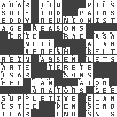 ACROSS 1. The sixth month of the Jewish calendar 5. Shallow baking pan 8. Sliced desserts 12. Flatfish 13. Wedding promise 14. Aches 15. Whirlpool 16. One who advocates reunion 19. Personal question 20. Thinks logically 21. One of the Great Lakes 23. Actress Charlotte 24. White ___ sheet 27. Famous astronaut Armstrong 30. Actor Alda or Thicke 31. Anew 34. Waist strap 35. It's straight from the horse's mouth 38. NE Netherlands city 40. Allows 41. Johnson of "Laugh-In" 42. Cigar-shaped 44. Russian ruler of old 45. Sty mamas 46. Snakelike fish 47. Scottish cap 50. Tiny particle 53. Speakers 57. Turn to the right 59. Supplementary 63. Liveliness 64. First name in cosmetics 65. Lair 66. Transmit 67. Pull apart 68. Conclusion 69. Fast planes DOWN 1. At sea 2. Evade 3. Tree or shrub in the Birch family 4. Marina Del _, California 5. Become fatigued 6. The main thing one is thinking about 7. Common sense 8. Baking dish 9. One more than two 10. Followers of ems 11. Fast jet (abbr.) 14. Introduce or present, as a question 17. And not 18. _ tizzy (2 wds.) 20. Coral ridge 22. More lacking in sense or substance 24. Toward shelter 25. Table seasoning 26. Pismires 28. Lyricist Gershwin 29. For fear that 30. Most capable 32. Compass dir. 33. Possessive pronoun 35. Assign a rank or rating to 36. Celtic language 37. Slanted text style (abbr.) 39. Modern: prefix 43. It was, poetically 47. Lacquered or enameled metalware 48. "We ___ not amused" (Victoria) 49. Floor covering 51. Stares 52. Intended 54. Periodic rise and fall of the sea level 55. Baking chamber 56. Tear apart 58. Conclusions 59. Put into a specified state 60. Purpose 61. Parent Teacher Association (abbr.) 62. For each 63. Curvy letter