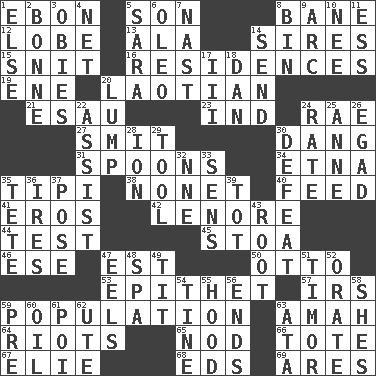 ACROSS 1. Inky black, to poets 5. Manchild 8. Object of repulsion 12. Ear part 13. According to 14. Male parents of animals 15. In a ____ (agitated or irritated) 16. Dwellings 19. Compass dir. 20. Of or relating to Laos or its people 21. Son of Isaac 23. Working for oneself (abbr.) 24. Actress Charlotte 27. Stricken, poetically 30. Mild oath, euphamism for damn 31. Soup utensils 34. Inactive volcano in Sicily 35. Native american tent (variation) 38. Music written for nine 40. Nourish 41. Greek god of love 42. Poe poem 44. Trial 45. Portico 46. Compass dir. 47. Eastern Standard Time (abbr.) 50. Von Bismarck 53. Curse 57. Big collection agency 59. Census information 63. Wet nurse 64. Debaucheries 65. Dreamland 66. Carry 67. Writer Wiesel 68. Begley and Asner 69. Ancient Greek god of war DOWN 1. Otherwise 2. Child's nurse 3. Off-Broadway awards 4. Fish or hair follower 5. "Two Mules for Sister ____" 6. Butter sub 7. Political cartoonist Thomas 8. Storage container 9. Curve 10. Born 11. Double-curved letter 14. Post 17. One more than two 18. Daniel's nick name 20. Mass 22. Aid 24. Assign a rank or rating to 25. Queen of England 1702-14 26. Mild oath 28. Electrically charged atom 29. Utensil 30. Outscore 32. Compass dir. 33. Elected reps. 35. Wig 36. Angers 37. Introduce or present, as a question 39. Small child 43. Carrot, for example 47. Snakelike fish 48. Health resort 49. Teat (slang) 51. Southeast Indonesia island 52. Speak pompously 54. Prong on a fork 55. Parka part 56. Extremities 58. "______ My Girl" (Turtles hit) 59. Before (prefix) 60. Lubricate 61. Luau course 62. Shoshoni 63. _ moment's notice (2 wds.)