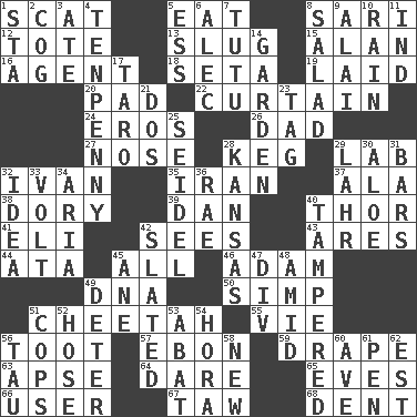 ACROSS 1. Go away! 5. Consume 8. Indian skirt 12. Haul 13. A hard, heavy blow 15. ____ Jay Lerner 16. Representative 18. Bristle 19. Put down 20. Groovy apt. 22. Window treatment 24. Greek god of love 26. Male parent 27. Characteristic smell of wine 28. Barrel 29. Experiment locale 32. "Terrible" tsar 35. SW Asia republic 37. Insect wing 38. Small, narrow, flatbottom fishing boat 39. One of the 12 tribes of Israel 40. Son of Odin 41. Connecticut Ivy Leaguer 42. Perceives with the eye 43. Ancient Greek god of war 44. _ moment's notice (2 wds.) 45. Everything 46. First man 49. Heredity factor (abbr.) 50. Simple or foolish person 51. Leopard's kin 55. Compete 56. A blast of a horn 57. Inky black, to poets 59. Window treatment 63. Domed church section 64. Have the gumption 65. Nights before holidays 66. One who uses or employs something 67. The 23rd letter of the Hebrew alphabet 68. Gouge DOWN 1. R.R. building 2. Gear tooth 3. Had dinner 4. 3-inch nail 5. Curvy letter 6. Actor Baldwin 7. Ballerina skirt 8. First course 9. Jai _ 10. Precipitation 11. Indiana (abbr.) 14. Place where plants grow 17. Edible starchy tuberous root 21. Two (Sp.) 23. Label 25. Beer mug 28. Sunflower state 29. Cowardly lion portrayer 30. _ vera 31. Taverns 32. The content of cognition 33. Electrical Unit 34. Roberta Peters solo 36. Actress Charlotte 40. ________ with (broke a safety seal) 42. Scheduled 45. One (Scot) 47. HTML Container Element 48. Among 49. Prevent from occurring 51. 911 reaches them 52. Flexible conduit 53. Blind as ____ 54. Israeli folk dance 56. The 19th letter of the Greek alphabet 58. ___ Haven, CT 60. "___ Maria" 61. Writing instrument 62. Eastern Standard Time (abbr.)