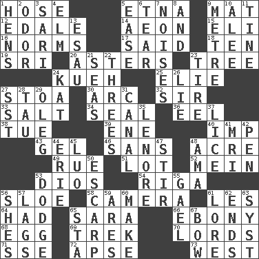 ACROSS 1. Stockings 5. Inactive volcano in Sicily 9. Floor covering 12. Peak District village in England 14. A really long time 15. Biblical high priest 16. Typical standards 17. Stated 18. "___ Little Indians" 19. Indian title of respect (Mr.) 20. Michaelmas daisies 23. Woody plant 24. Malaysian steamed pastry 25. Writer Wiesel 27. Portico 30. Curve 32. Title for a knight 33. Table seasoning 34. Lick closed 36. Snakelike fish 38. Third day of the wk. 39. Compass dir. 40. Naughty child 43. Set 46. Without 48. Measure of real estate 49. Sorrow 51. Car dealer's back yard 52. Count _ (2 wds.) 53. "Vaya con ____" 54. Port city in Latvia 56. A type of plum 58. Device for capturing images 61. French article 64. Possessed 65. "Two Mules for Sister ____" 66. Dark wood 68. Oval reproductive body of a fowl 69. Long journey 70. Domineers 71. Compass dir. 72. Domed church section 73. 270 degrees DOWN 1. Coop moms 2. Scent 3. Indian skirt 4. Shade tree 5. Relaxation 6. Lacerate 7. Annoying sounds 8. Plus 9. Distance measurement (Brit.) 10. Toward shelter 11. Prong on a fork 13. Son of Isaac 21. Oceans 22. Threesomes 23. Become fatigued 24. Krazy ___ of comics 26. Falsehood 27. Fast jet (abbr.) 28. The 19th letter of the Greek alphabet 29. Cassini of fashion 31. Lessep's creation 35. Poe poem 37. Louse (plural) 41. Medical imaging device (abbr.) 42. Writing instrument 44. 4th largest of the Great Lakes 45. Nilotic language 47. Tumult 48. Nursemaid (var.) 50. Fortification 53. Evade 55. Highlander 56. "______ My Girl" (Turtles hit) 57. Straggles 59. Ancient Greek god of war 60. Create 61. Old wives' tales, e.g. 62. Extremities 63. System (abbr.) 65. R.R. building 67. Ribbon knot