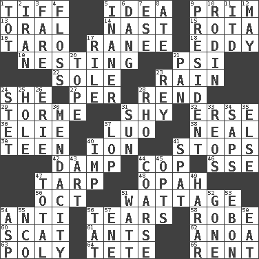 ACROSS 1. Small quarrel 5. It may be bright or harebrained 9. Demure 13. Of the mouth 14. Political cartoonist Thomas 15. Round or rotation of duties 16. Edible starchy tuberous root 17. Indian princess (variant) 18. Whirlpool 19. Nestling 21. Air pressure measure (abbr.) 22. Flatfish 23. Precipitation 24. A female animal or person 27. For each 28. Tear apart 29. Singer Mel 31. Like a shrinking violet 32. Celtic language 36. Writer Wiesel 37. Nilotic language 38. Be tempered by heat 39. Adolescent 40. Electrically charged atom 41. Halts 42. Moist 44. Police officer (slang) 46. Compass dir. 47. Canvas cover 48. Brightly colored fish 50. Sep. follower 51. Electrical Measurement 54. Against 56. Rends 58. Loose flowing garment 60. Leave at once 61. Pismires 62. Small Philippine buffalo 63. Many (prefix) 64. False hair 65. Monthly bill DOWN 1. Small child 2. SW Asia republic 3. Conductor's collection 4. Soft thread for cleaning between teeth 5. More empty; more void 6. Mild oath, euphamism for damn 7. Compass dir. 8. Had dinner 9. Elected leader of a country 10. "The Thinker" sculptor 11. It would 12. Fifth month 17. Cause heat under the collar 20. Drink excessively 21. Baking dish 23. Marina Del _, California 24. Proofreading order 25. Opening into or through something 26. One of the Great Lakes 28. 17th letter of the Greek alphabet 30. Ananias' fault 31. Player for Phoenix 33. Vintage cars 34. Plant excrements 35. Otherwise 37. Chop off 40. Mischievous child 41. Petty quarrel 43. Tate display 44. Rough 45. Chooses 47. Add up to 49. Ethiopian city, capital of Harari 51. Electrical Unit 52. Went 53. Inky black, to poets 54. Cleo's killer 55. Non-commissioned officer (abbr.) 56. Make lace 57. Compass dir. 59. Ingest