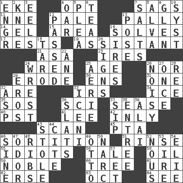 ACROSS 1. Supplement with great effort 4. Choose 7. Sinks 11. Compass dir. 12. Diluted with white 13. Chummy 14. Set 15. Type of rug 16. Finds the solution 17. Musical pauses 19. Aide 21. White ___ sheet 23. Angers 24. Songbird 25. Grow older 26. Not either 29. Wear away 30. Followers of ems 31. Single 32. "We ___ not amused" (Victoria) 33. Big collection agency 34. Frozen water 35. Distress signal 36. _-fi 37. Gospel singer Marvin 40. Pacific Standard Time (abbr.) 41. Area sheltered from the wind 42. In an inward manner 43. Glance over 45. Parent Teacher Association (abbr.) 46. Determination 51. Wash lightly 55. Foolish or stupid persons 56. Falsehood 58. Petroleum 59. Impressive in appearance 60. Woody plant 61. RI univ. 62. Celtic language 63. Sep. follower 64. Observe DOWN 1. Engineer (abbr.) 2. Leg joint 3. Snakelike fish 4. Rowing implement 5. Entreaty 6. Afternoon social gatherings 7. Table seasonings 8. Inventor's middle name 9. Small, secluded valley 10. System (abbr.) 12. Went by 13. Airs 16. Begets 18. Pacific island yam 20. Attaches a signature 22. A saturated hydrocarbon 24. Take or capture by force 25. Nest on high 26. Annoyingly loud 27. Single time 28. Portuguese money of account (variant) 29. Greek god of love 32. Viper 33. Ancient Celtic tribe of eastern Britain 36. Narrow boards 37. Small drink 38. Main course 39. Jai ____ 43. Took without asking 44. Quote 46. Trig term 47. Scent 48. Chest bones 49. Von Bismarck 50. Drug cop 52. Horse sense 53. Title for a man of rank and authority 54. Writer Wiesel 57. Allow