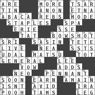 ACROSS 1. "We ___ not amused" (Victoria) 4. Greater amount 8. Russian ruler of old 12. Shallow baking pan 13. At once, immediately (arch.) 14. Inactive volcano in Sicily 15. Phillipine bananalike plant 18. Confederate soldiers (slang) 19. Method 20. Paper fasteners 22. Health resort 23. One of the Great Lakes 24. Compass dir. 25. Make lace 26. The distance a bow sends an arrow 30. Indian title of respect (Mr.) 33. Indian antelope 36. Wig 37. Not recorded 39. Teachers' org. 40. Fast planes 41. Hereditary estate 42. Taiwanese island in East China Sea 44. Small child 45. Commissioned military rank 47. Area sheltered from the wind 50. Promise 51. Does sums 53. Modern: prefix 54. Pre-World Series prize 57. Within a short period 59. Merit 61. With great haste 63. Is not 64. Enthusiastic 65. Lyricist Gershwin 66. "Silly old bear" 67. Scottish caps 68. Part of a journey DOWN 1. _ moment's notice (2 wds.) 2. Chest bones 3. Maternal 4. Female horse 5. Singles 6. Director Reiner 7. Followers of ems 8. Storms 9. Portico 10. Also 11. Actress Charlotte 16. Heavy open wagon 17. Capital of Western Samoa 21. Allows 22. Compass dir. 24. Male child 26. Prejudice 27. Behest 28. Von Bismarck 29. Trial 30. A hard, heavy blow 31. Travel on an animal 32. _ the terrible 34. Of or related to the anus 35. Put into a specified state 38. Veterans Day date 42. Opening into something insatiable 43. Uhlan (variant) 46. Friend of Pooh 48. Pulitzer Prize-winning author Ferber 49. Dutch treat 52. Slow-paced one 53. Words to Nanette 54. Demure 55. Conclusions 56. Hoop that covers a wheel 57. Small drink 58. Bear (Spanish) 59. Ingest 60. Actress Gardner 62. Tired old horse