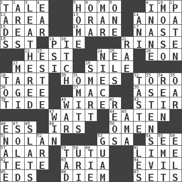 ACROSS 1. Falsehood 5. Like (prefix) 9. Naughty child 12. Length times width 13. NW Algerian seaport 14. Small Philippine buffalo 15. Letter starter 16. Female horse 17. Political cartoonist Thomas 18. Fast jet (abbr.) 19. Sliced dessert 21. Wash lightly 22. Behest 24. Teachers' org. 26. Period of immesurable duration 27. Of or pertaining to a meson 28. Drop; flow; fall 29. Small pie 30. Dwellings 32. "Corrida" creature 36. Double curve, resembling the letter S 37. Apple computer (short form) 38. Toward the sea 39. Event that recurs at intervals 40. One who wires 42. Use a swizzle stick 43. Electrical Unit 44. Eroded 46. Curvy letter 49. Big collection agency 50. Sign of things to come 51. Pitcher Ryan 53. Girls' org. (abbr.) 54. Observe 57. Having or resembling wings 58. Ballerina skirt 61. Citrus frut 62. Wig 63. Operatic vocal solo 64. Morally bad or wrong 65. Begley and Asner 66. South Vietnam president (1954) 67. Arranges properly for use DOWN 1. Small amounts or degrees 2. Ancient Greek god of war 3. Tough but pliablecoriaceous 4. Ewer handle 5. Residence 6. Mouth or opening 7. Third mo. 8. Single 9. Lacking in sense or substance 10. With motion or animation 11. Eucharist need 14. Cuckoo 19. Air pressure measure (abbr.) 20. Hankering 21. Actress Charlotte 23. First name in cosmetics 24. Sibling's daughter 25. Raised railways 27. Wise men 28. Don Adams' spy role 29. Small child 31. Leaves out 32. Clothes sense 33. Clearly or manifestly demonstrative 34. It's straight from the horse's mouth 35. Boat paddle 40. Armed conflict 41. Vintage cars 43. Victory 45. Nanny (var.) 46. Related on the mother's side 47. Having a sole or soles 48. Narrow boards 52. "We ___ not amused" (Victoria) 53. Island territory of the United States 55. Give off 56. Snakelike fish 58. Bit 59. RI univ. 60. Make a knot 61. French article